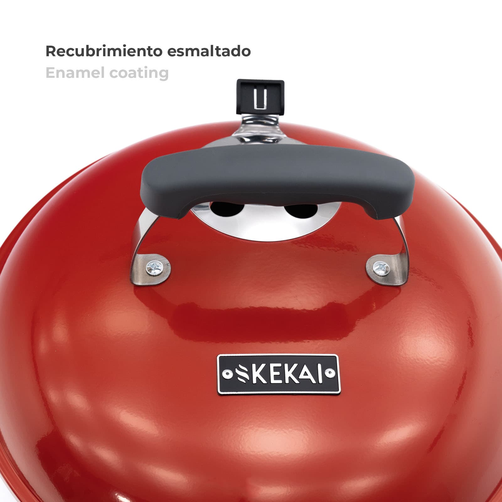 Barbacoa de sobremesa de la marca KEKAI, fabricada en acero con acabado esmaltado. Uso de carbón como combustible. Con superficie de cocción de 35 cm. Tapa con sistema de bloqueo y plato recoge cenizas de aluminio.