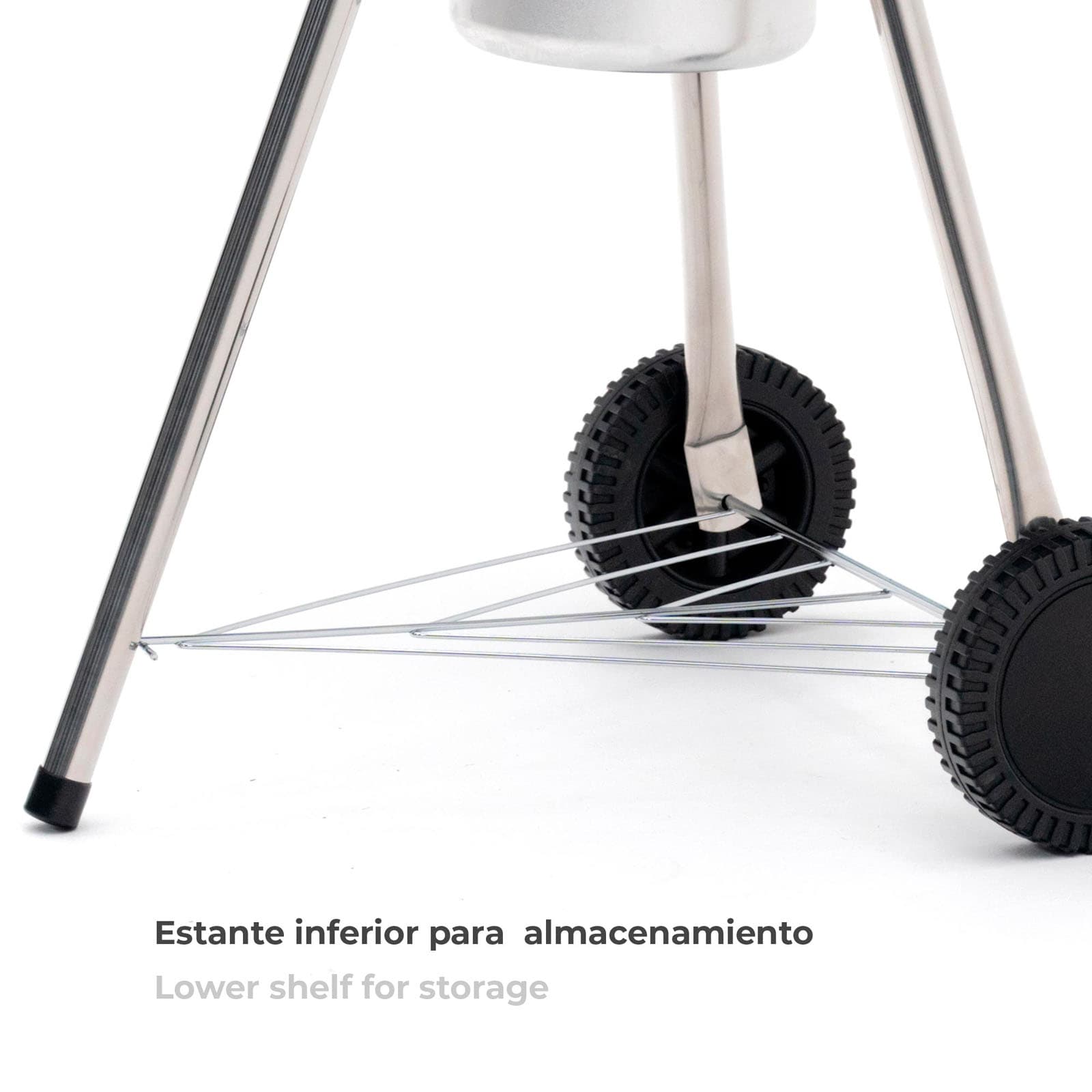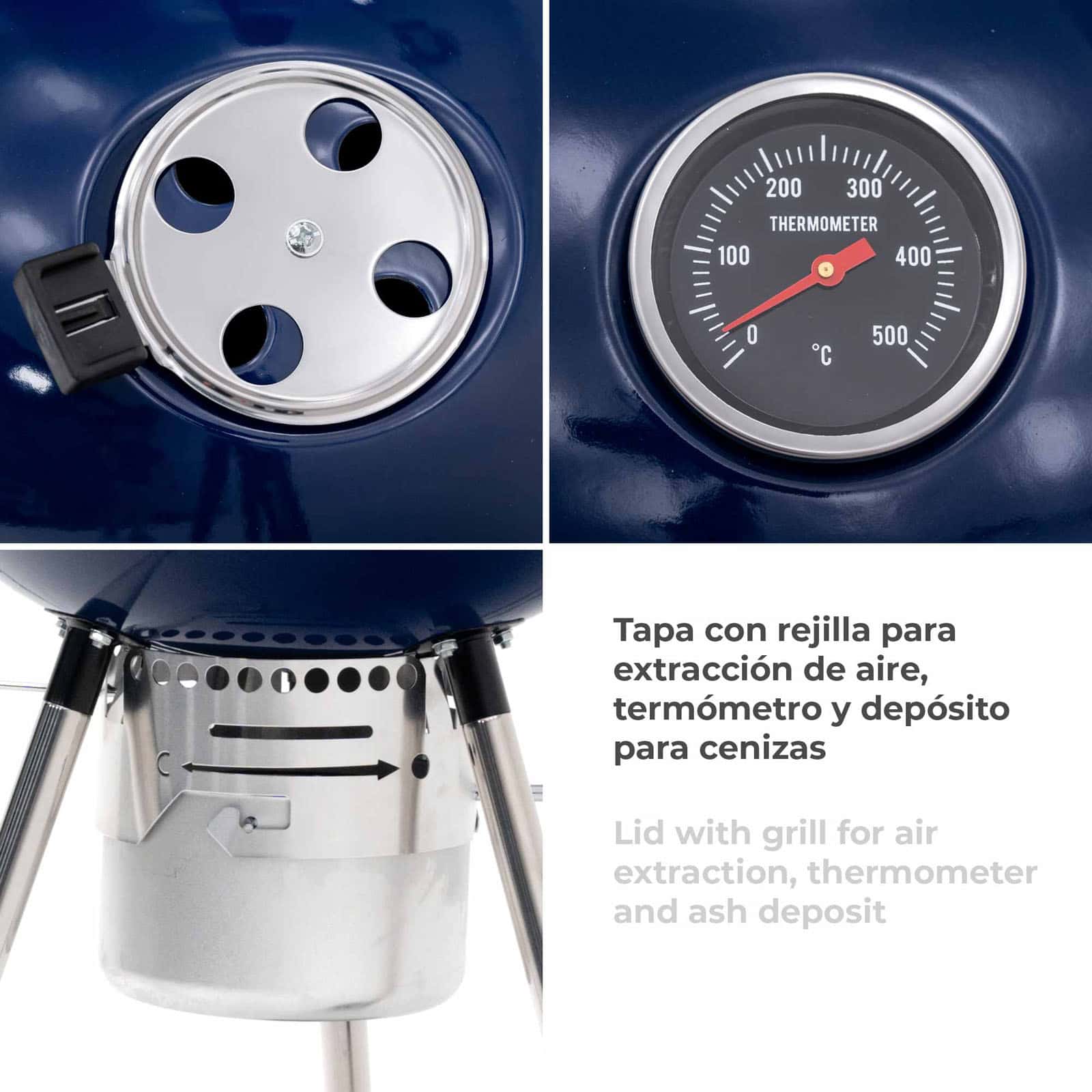 Barbacoa portátil de carbón de la marca KEKAI, hecha en acero esmaltado. 46 cm de superficie de cocción. Mangos de plástico termorresistentes. Tapa con rejilla para extracción de aire, termómetro, depósito para cenizas y base de apoyo en Baquelita.
