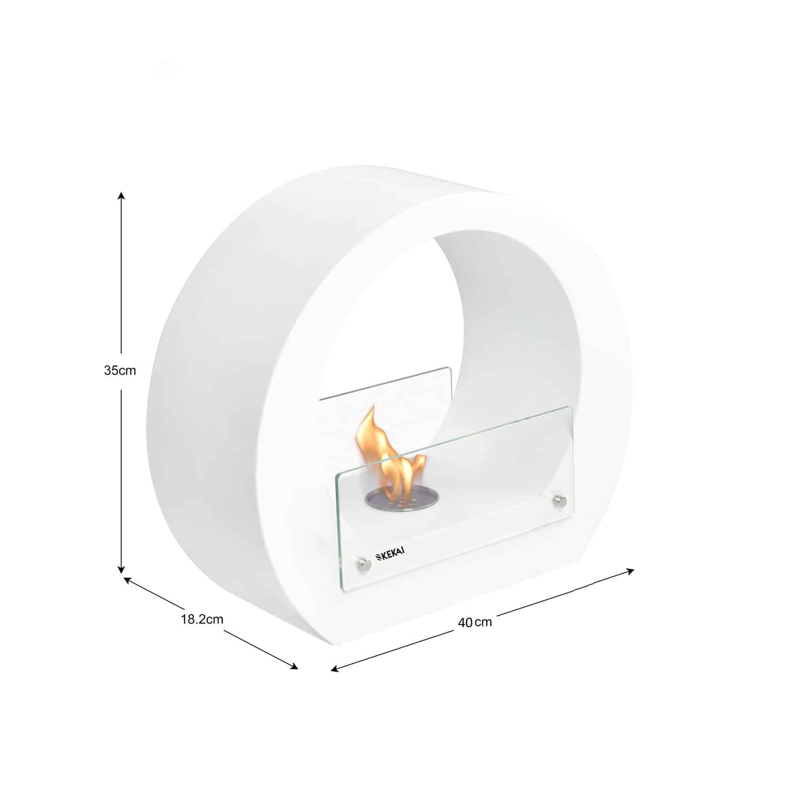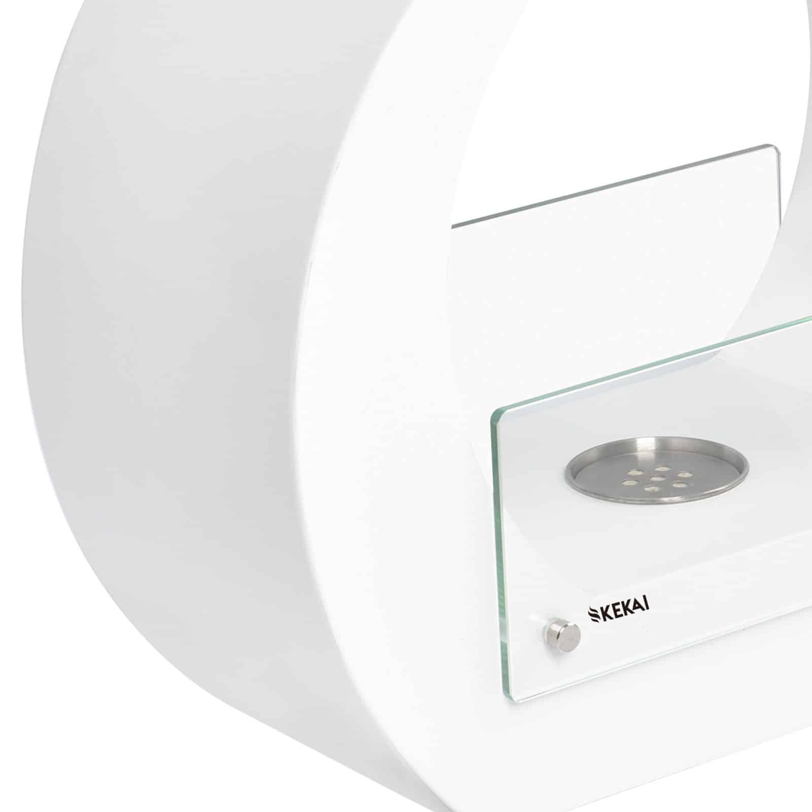 Chimenea de bioetanol de sobremesa de la marca KEKAI. Con quemador de acero inoxidable protegido con vidrio templado de seguridad. Depósito de 150 ml: 60 minutos de combustión. Extintor manual incluido. No requiere instalación.