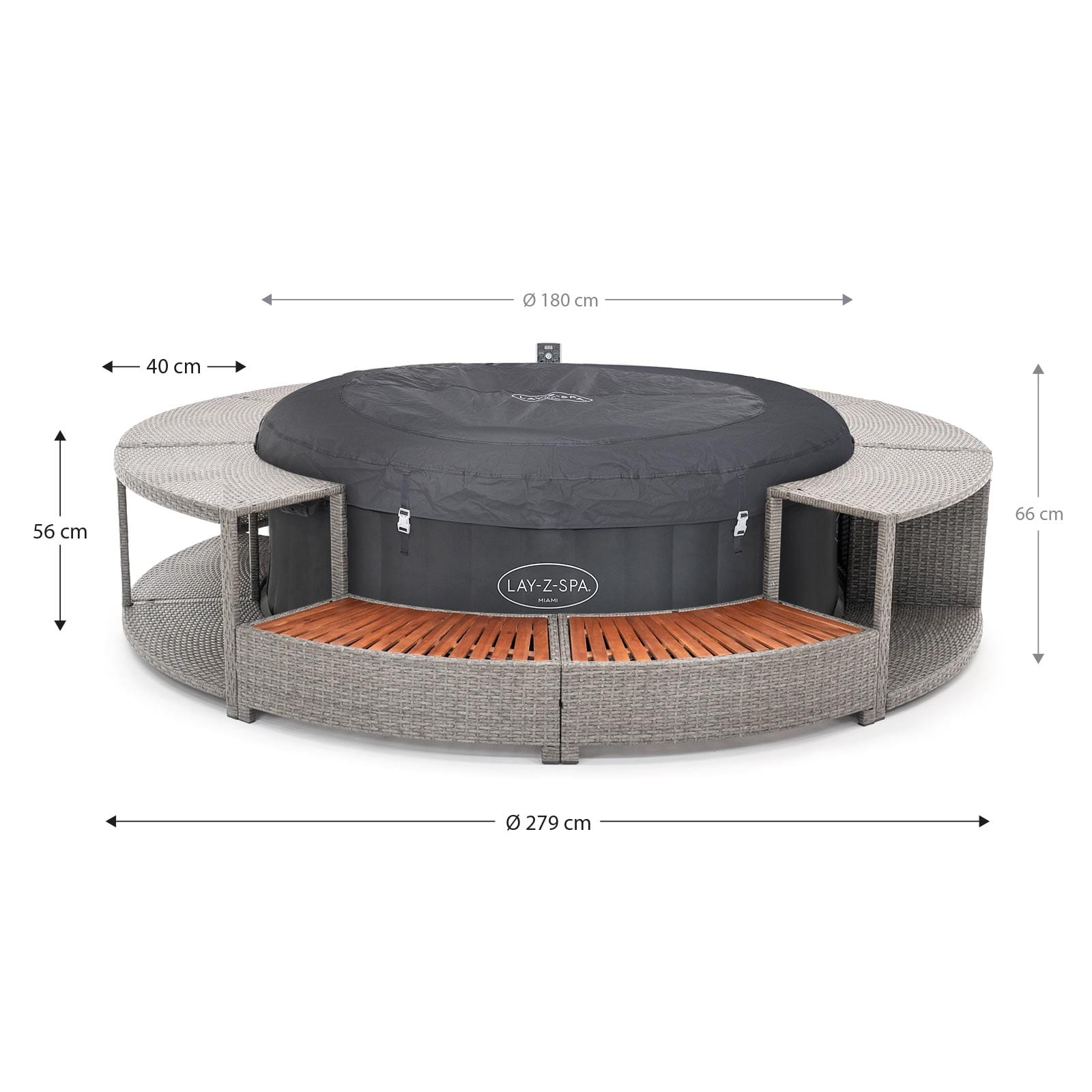 Combinación de spa hinchable de exterior con revestimiento circular de ratán PE y armazón de acero de la marca K2O. Sistema de masaje de burbujas AirJet™, 120 chorros de aire. Calentamiento automático. Dispensador de cloro ChemConnect™. Capacidad: 4 pax.