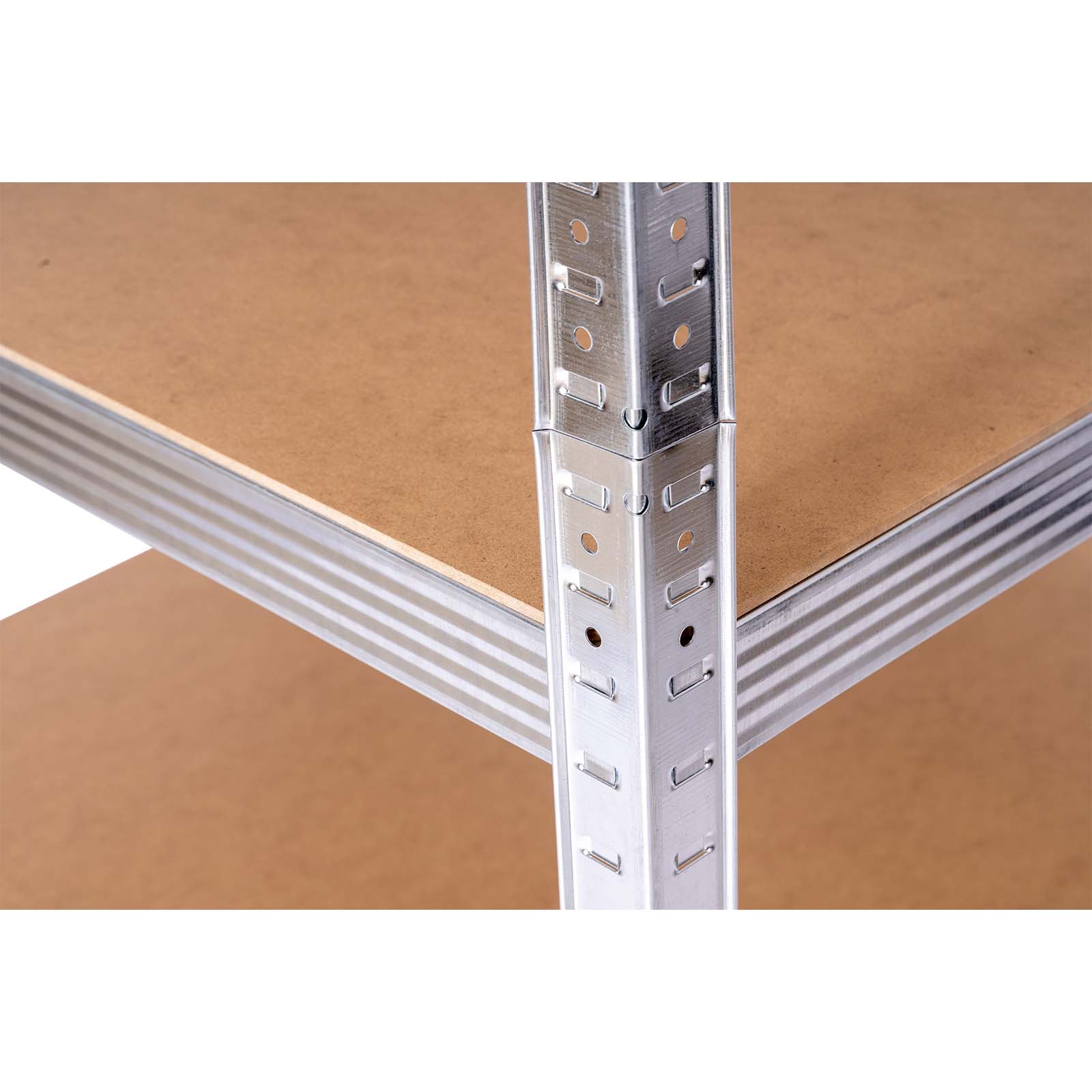 Estantería de esquina en acero galvanizado con 5 baldas ajustables de MDF. Soporta hasta 175 kg por balda (875 kg en total). Ideal para garajes, trasteros o zonas de almacenaje.