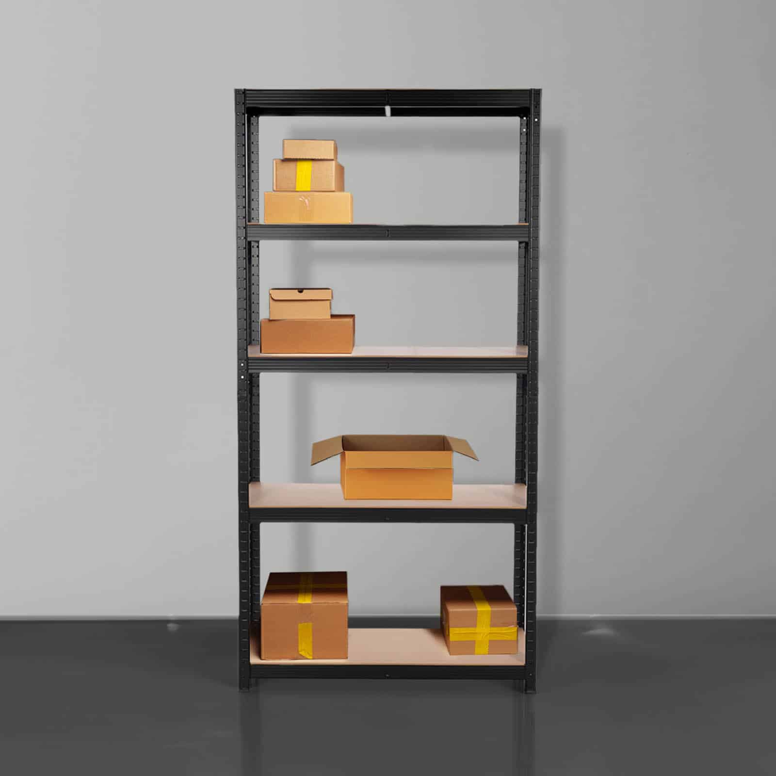 Estantería Hans Plus con estructura fabricada en acero color negro. Tiene 5 estantes hechos de MDF regulables en posición y altura para que adaptes el espacio según tus necesidades e incluso puede transformarse en un útil banco de trabajo. Además, cumple con la normativa europea de seguridad y tiene el certificado REACH. Puedes utilizarla tanto para fines profesionales como domésticos.