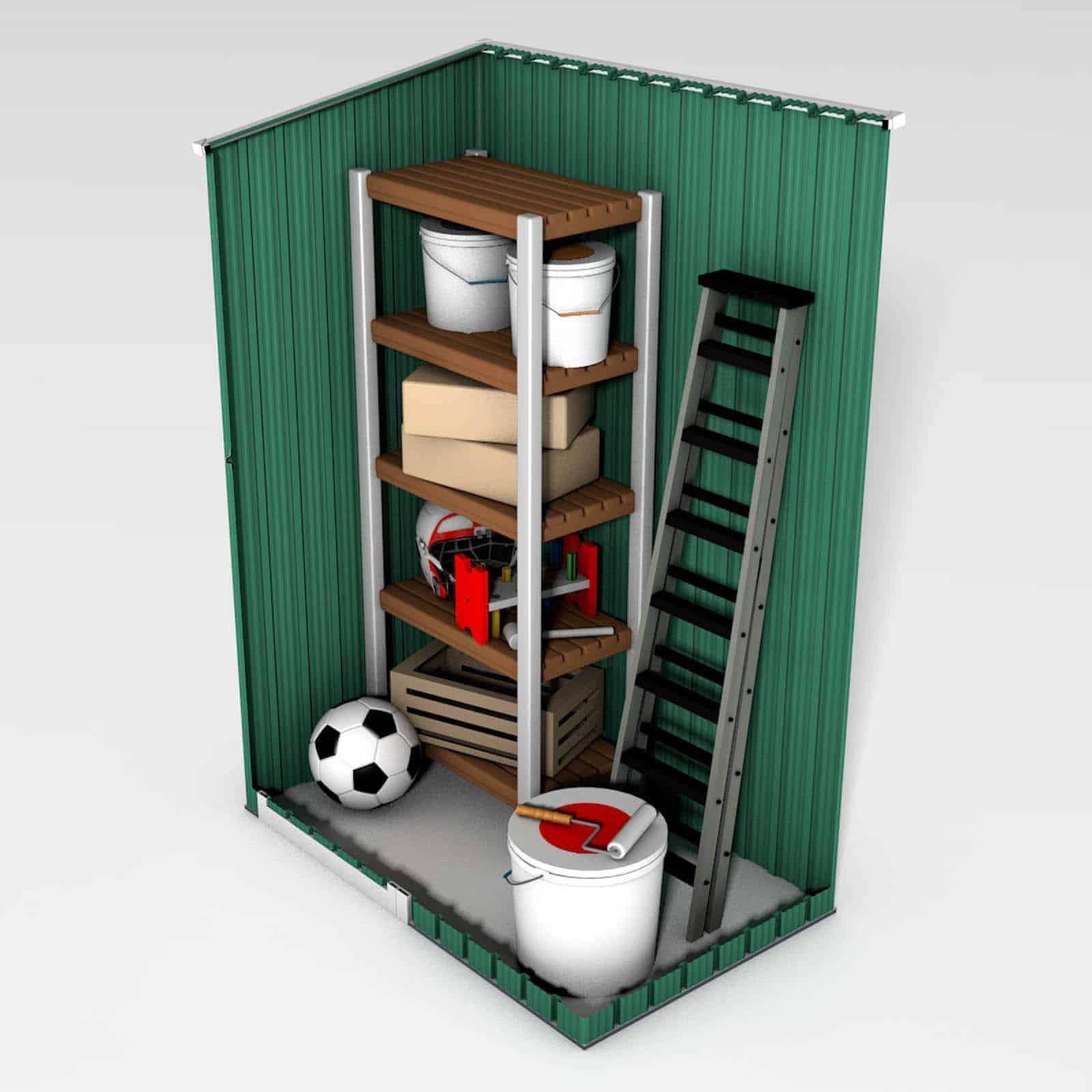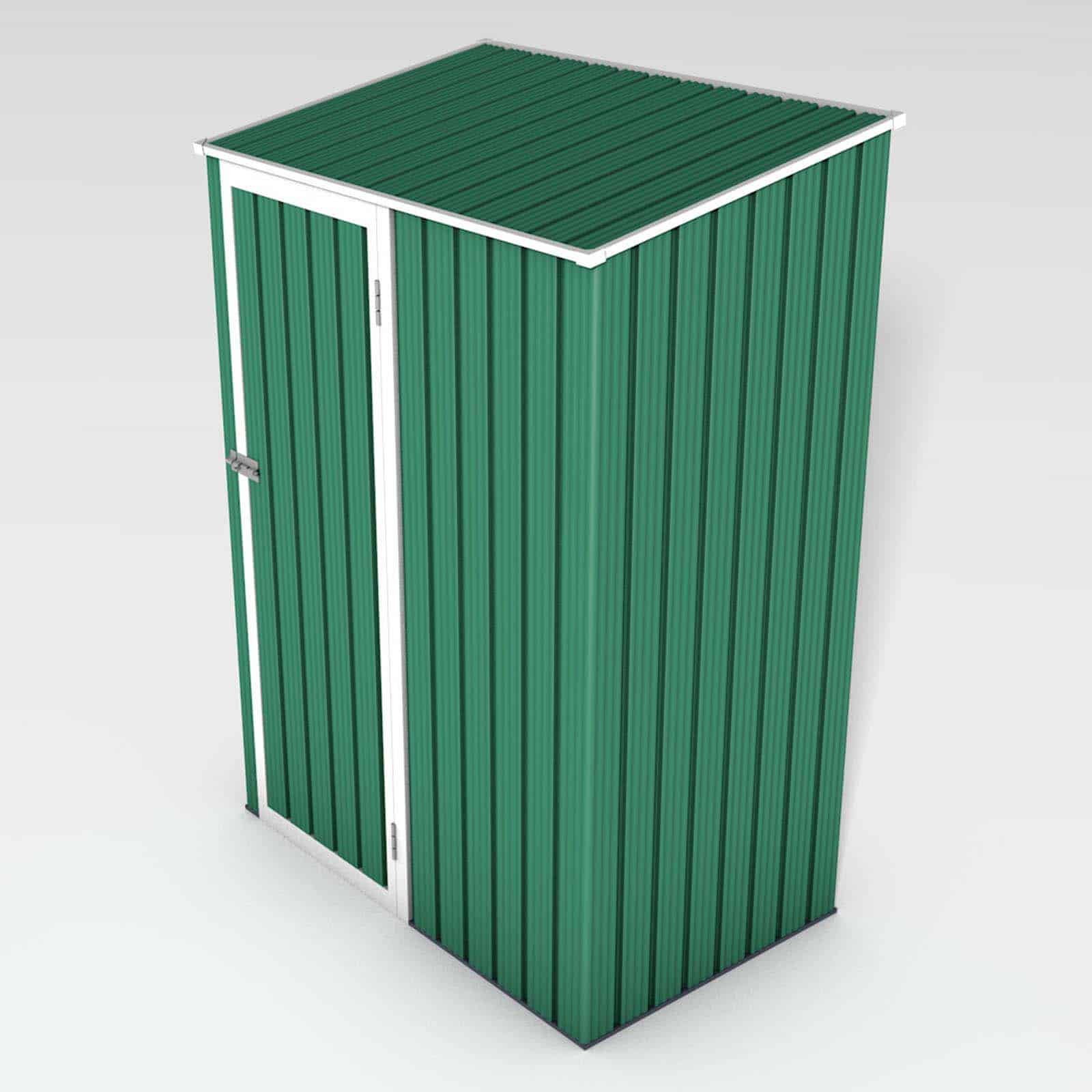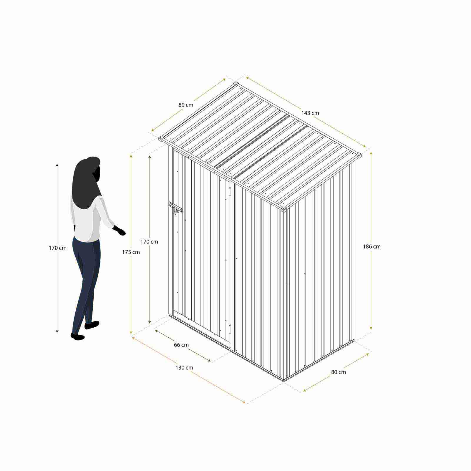 Caseta de jardín hecha en acero galvanizado. Techo a un agua. Puerta abatible con posibilidad de colocar candado. No incluye suelo. 10 años de garantía anti-corrosión.