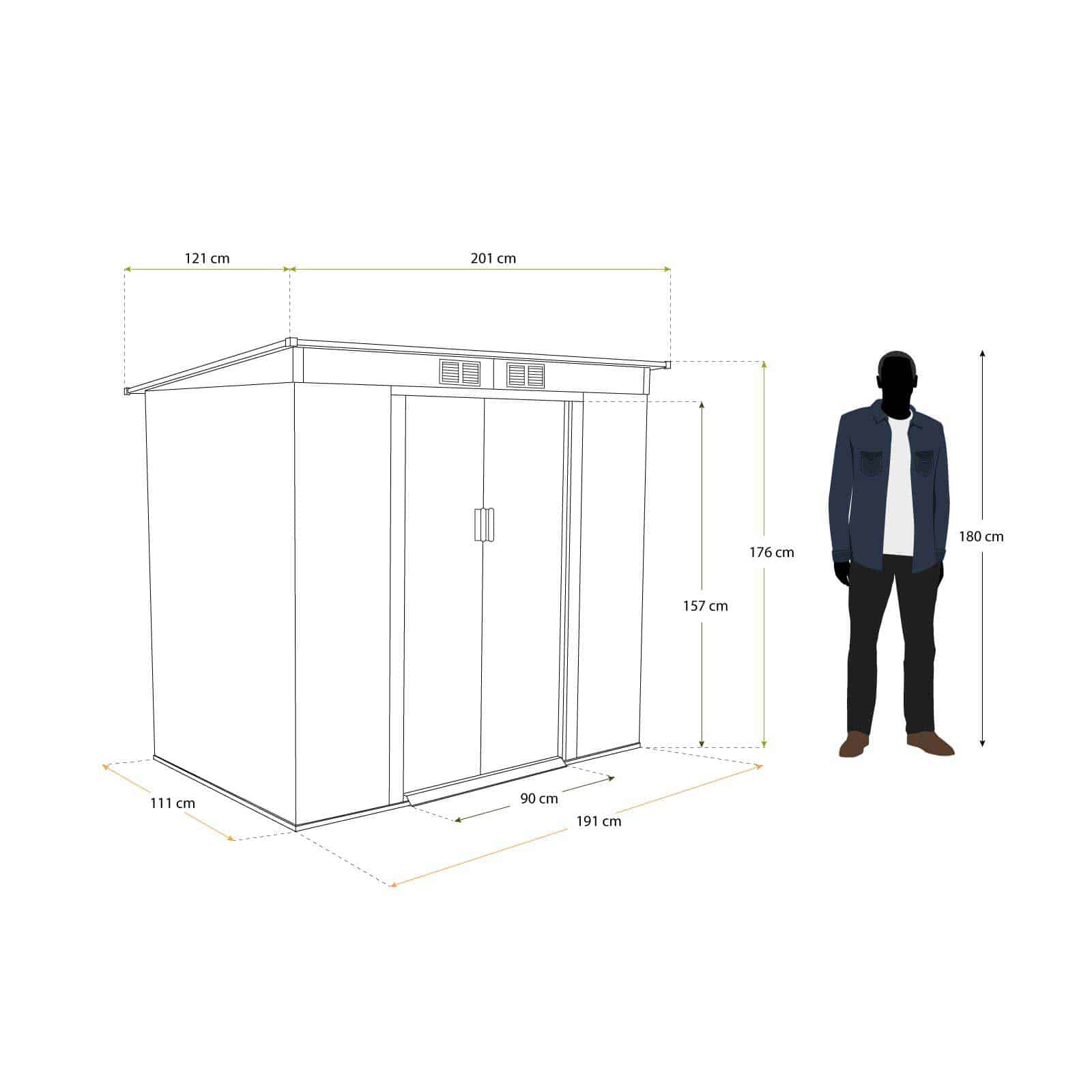 Caseta de jardín Buckingham fabricada en acero galvanizado bicolor de 0,25 mm de espesor. Marco de acero zincado de 0,5-0,8 mm. Con techo a un agua. Puerta doble deslizante apta para candado (no incluido). No incluye suelo. 10 años de garantía anti-corrosión.