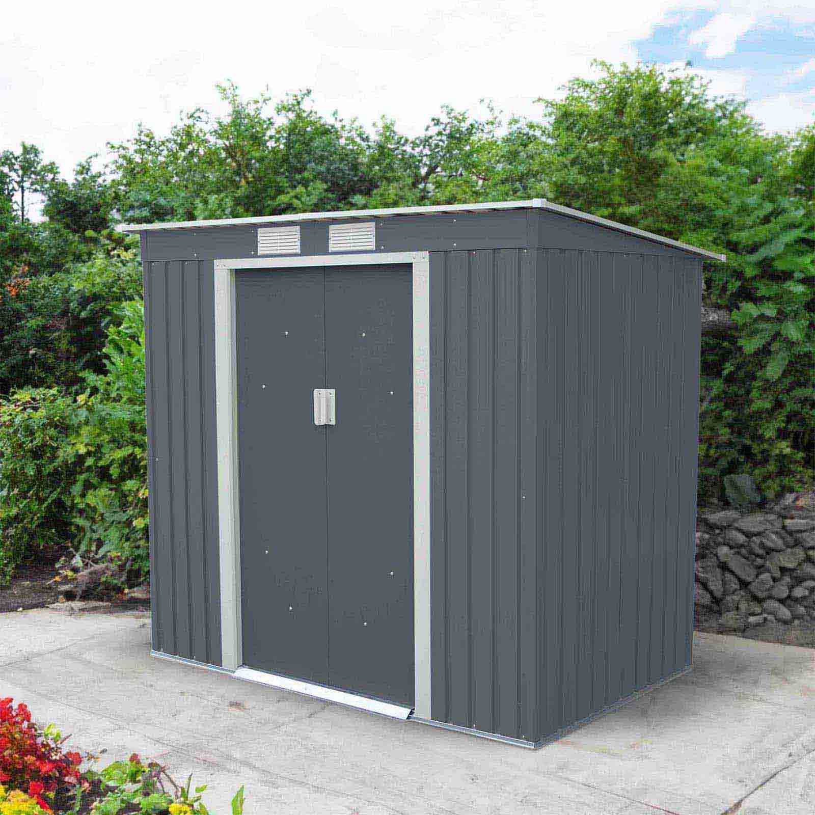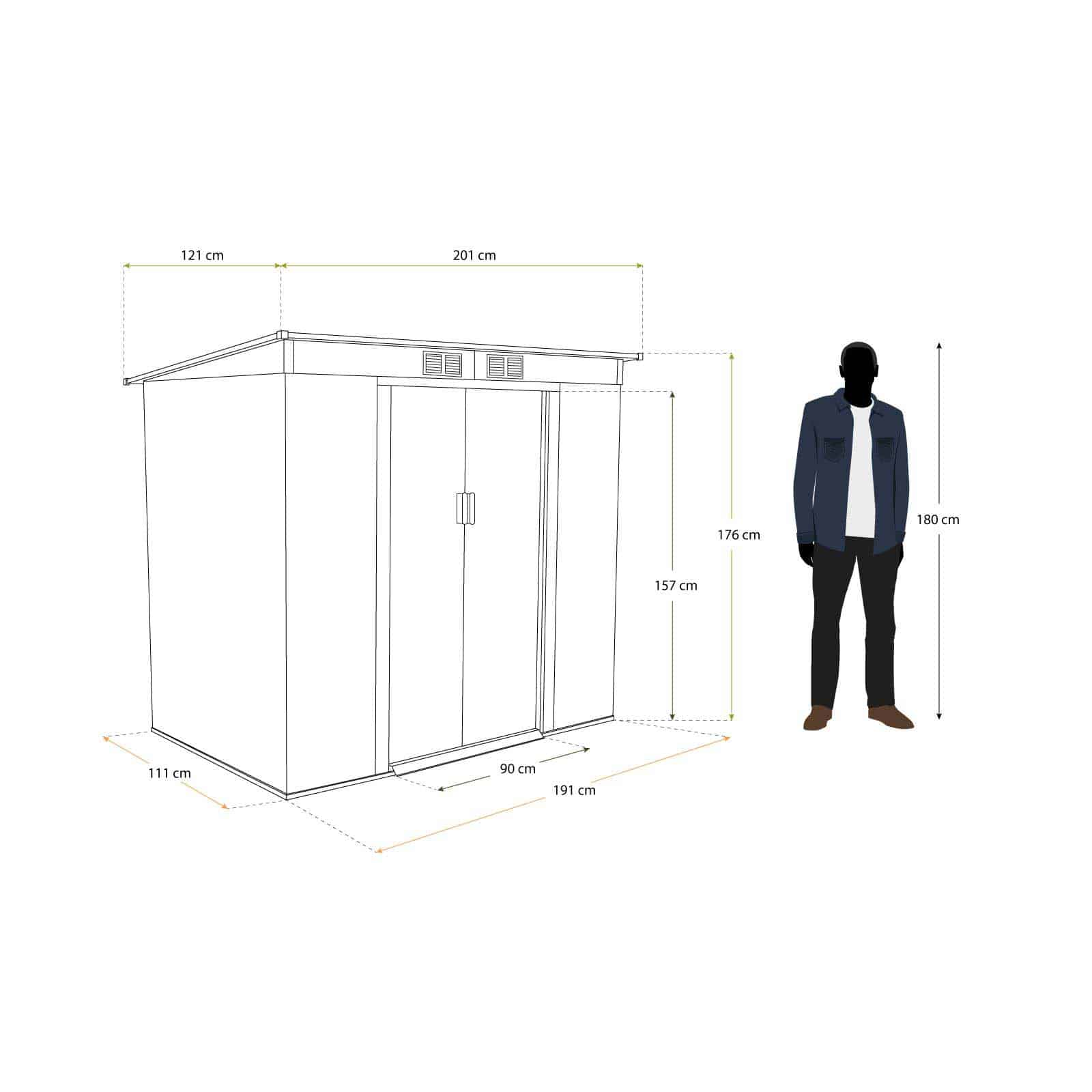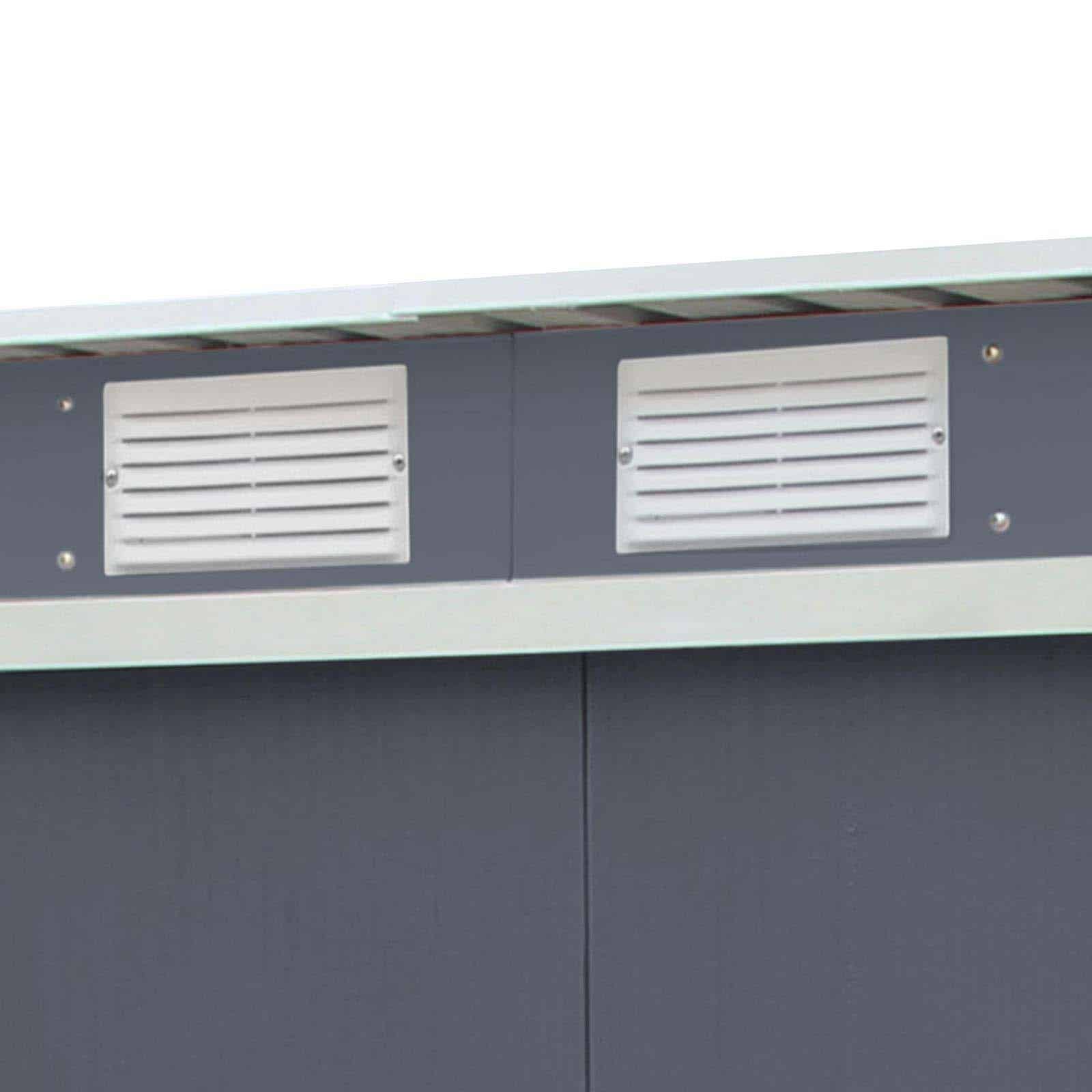 Caseta de jardín hecha en acero galvanizado de 0,25 mm, color gris antracita. Estructura reforzada con acero zincado de 0,5-0,8 mm. Techo a un agua. Puerta doble deslizante apta para candado (no incluido). No incluye suelo. 10 años de garantía anti-corrosión.