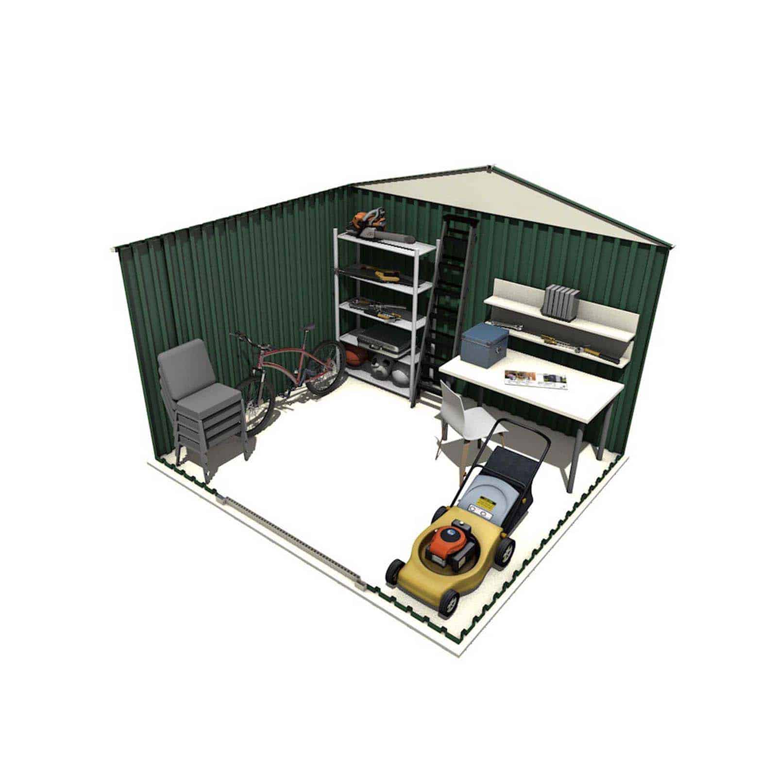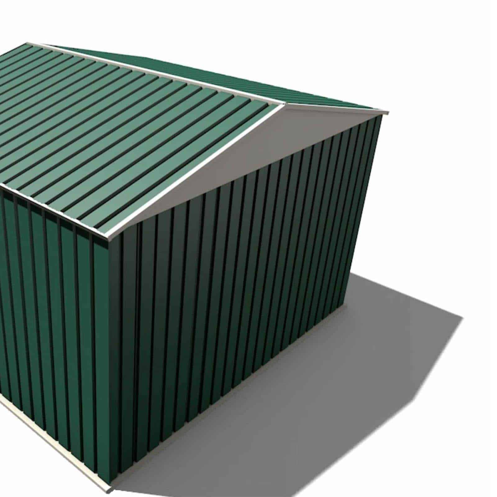 Caseta de jardín fabricada en chapa de acero galvanizado en color verde y blanco. Paneles laterales nervados. Tejado a dos aguas. Puerta corredera doble con opción a candado (no incluido). Respiradero. No tiene suelo. 10 años de garantía anticorrosión.
