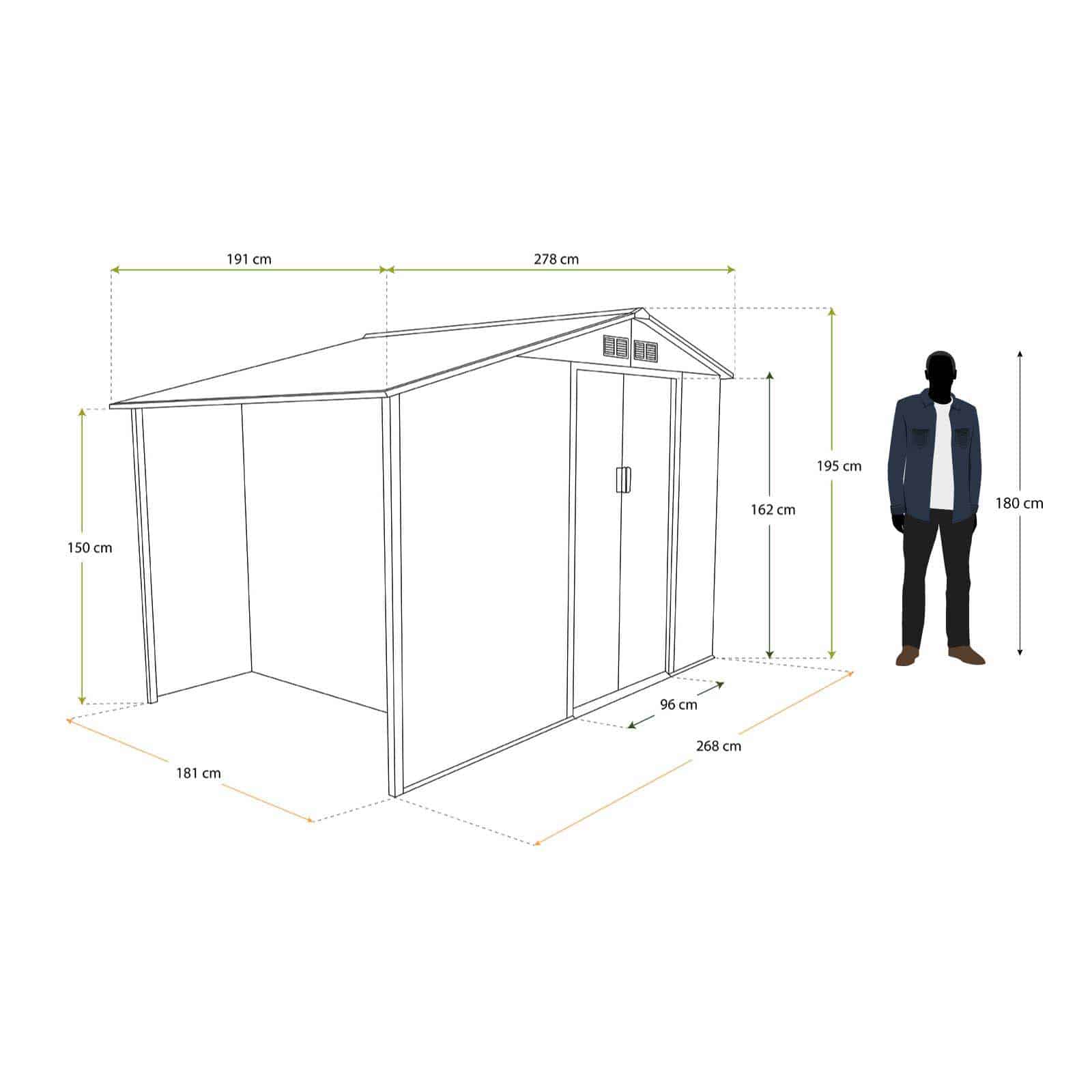 La caseta de jardín Ontario está fabricada en chapa de acero galvanizado con paredes de 0,25 mm de grosor y pre-tinte en caliente. Así, su durabilidad es mayor. Con paneles laterales nervados que le suman robustez. La puerta corredera doble facilita el acceso, mientras que su tejado a dos aguas evita la acumulación de agua, garantizando una mayor vida útil de la caseta. Uno de sus puntos fuertes es el anexo de almacenaje exterior. Esta funcionalidad adicional permite una organización más efectiva de tus pertenencias o puede también utilizarse de leñero. Además, la protección en las esquinas garantiza una mayor resistencia ante posibles impactos o daños. Aunque no cuente con ventanas, está equipada con respiraderos, que aseguran una adecuada ventilación, evitando así la condensación interna. Con posibilidad de incorporarle un candado (no incluido). Suelo no incluido.