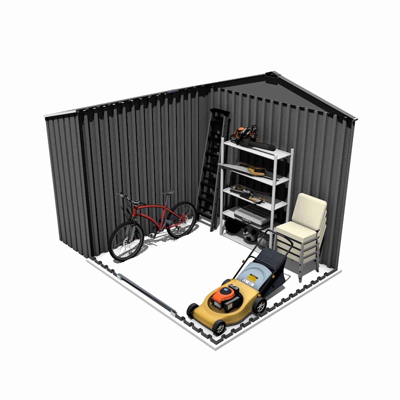 Caseta de jardín en acero galvanizado en gris antracita/blanco. Paneles laterales nervados y puerta corredera doble deslizante. Con protección en las esquinas. Anexo de almacenaje exterior que puede usarse de leñero. No incluye suelo. 10 años de garantía anticorrosión.