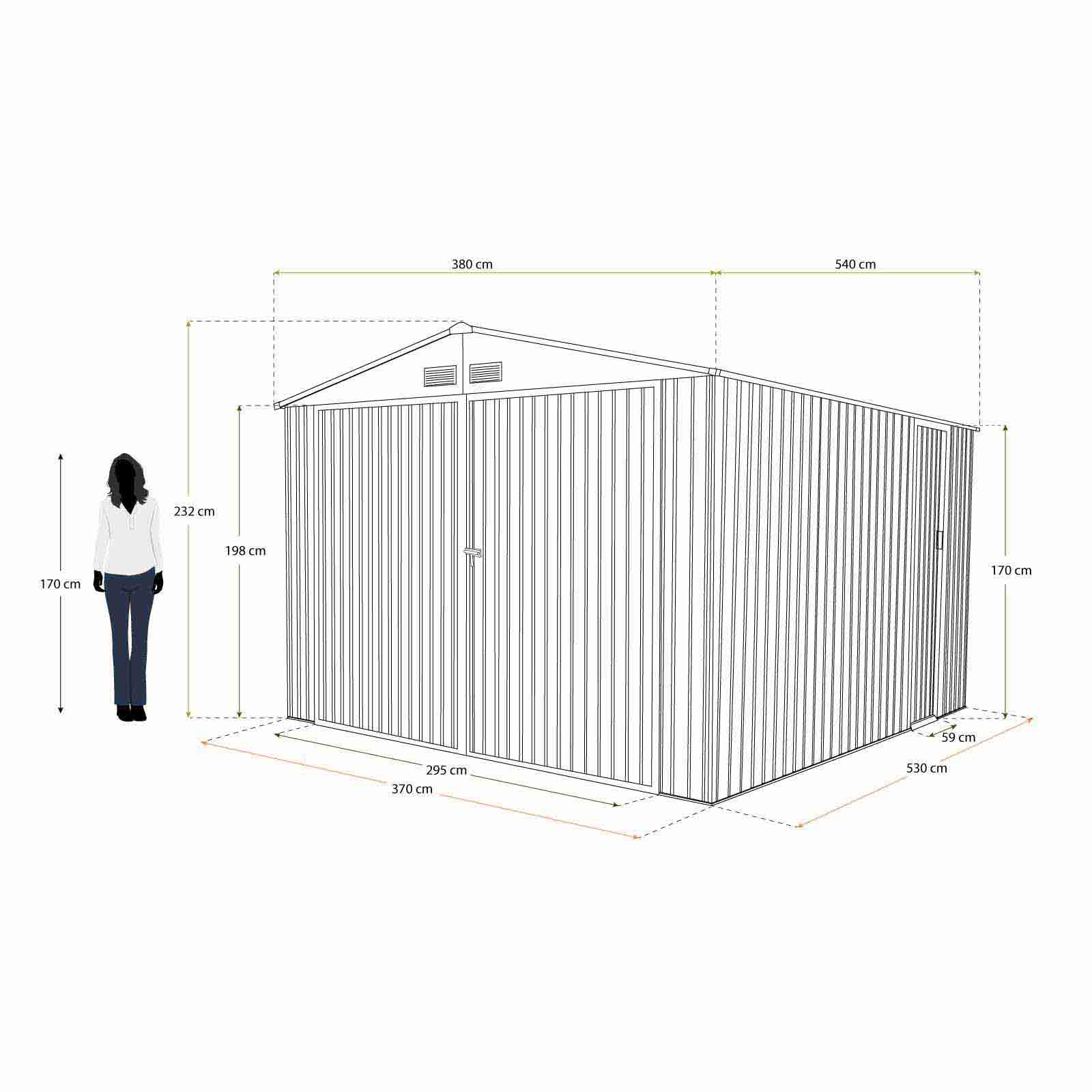 El garaje metálico Oxford verde de 20,5 m² ofrece un espacio amplio y seguro para vehículos y herramientas. Su estructura reforzada incluye un tejado a dos aguas que evita acumulaciones de agua de lluvia, doble puerta abatible para facilitar el acceso y puerta lateral con llave para mayor seguridad. Además, cuenta con rejillas de ventilación para mantener el interior fresco y seco. No incluye suelo. Se adapta a cualquier superficie.