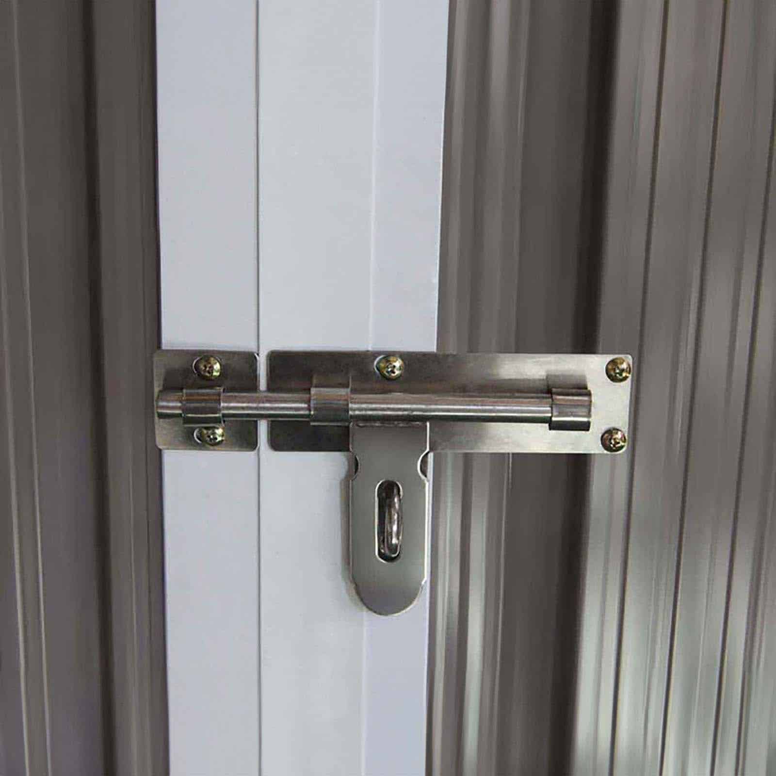 - Puertas dobles abatibles: entrada amplia y cómoda para vehículos y herramientas de gran tamaño, equipada con pestillo de acero inoxidable con pasador para mayor seguridad.