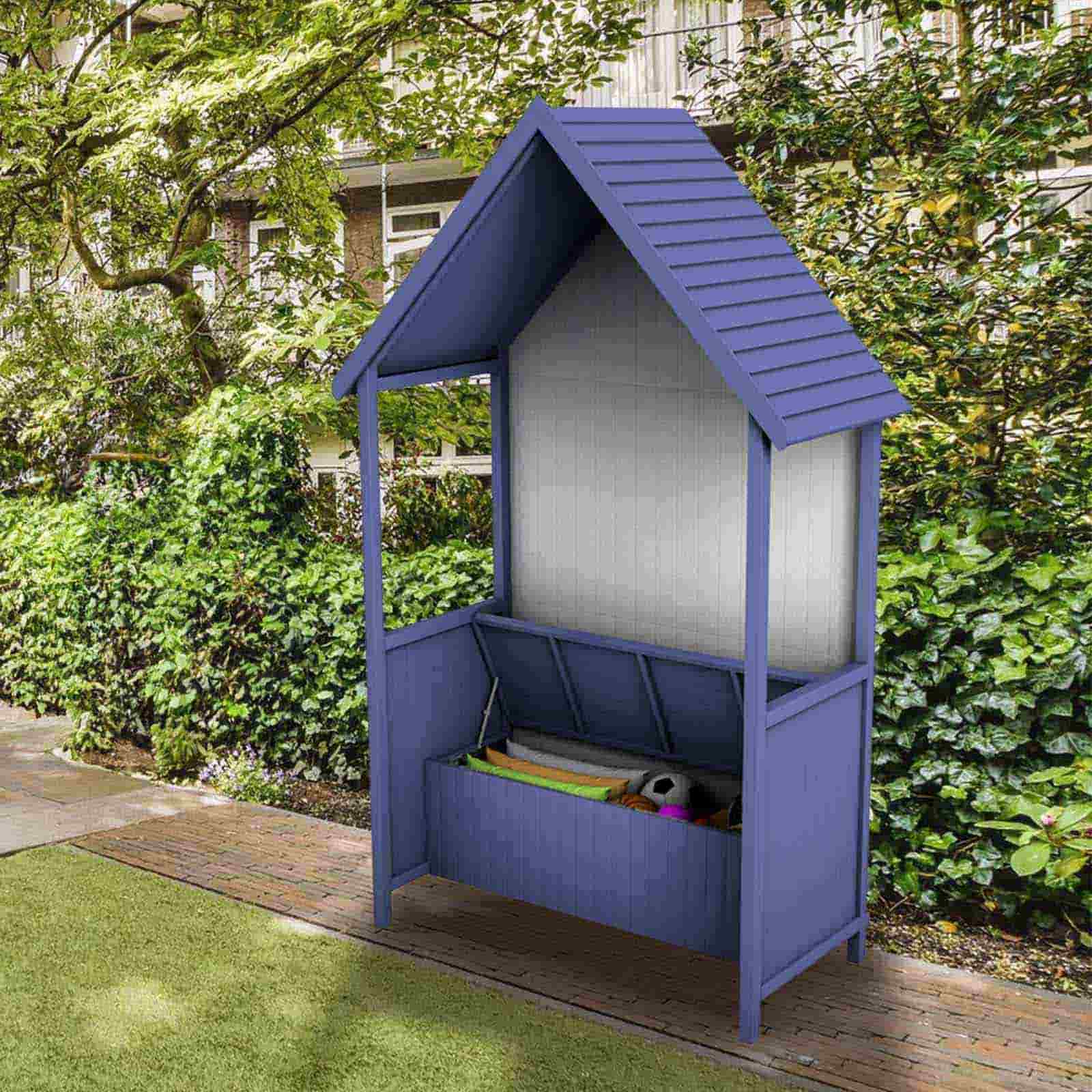 Esta marquesina con doble función fabricada en madera morada tratada para exteriores ofrece un cómodo asiento con respaldo y un baúl de almacenamiento debajo. Una solución perfecta cuando cuentas con poco espacio. Se adapta a todos los espacios y es de fácil instalación y mantenimiento.