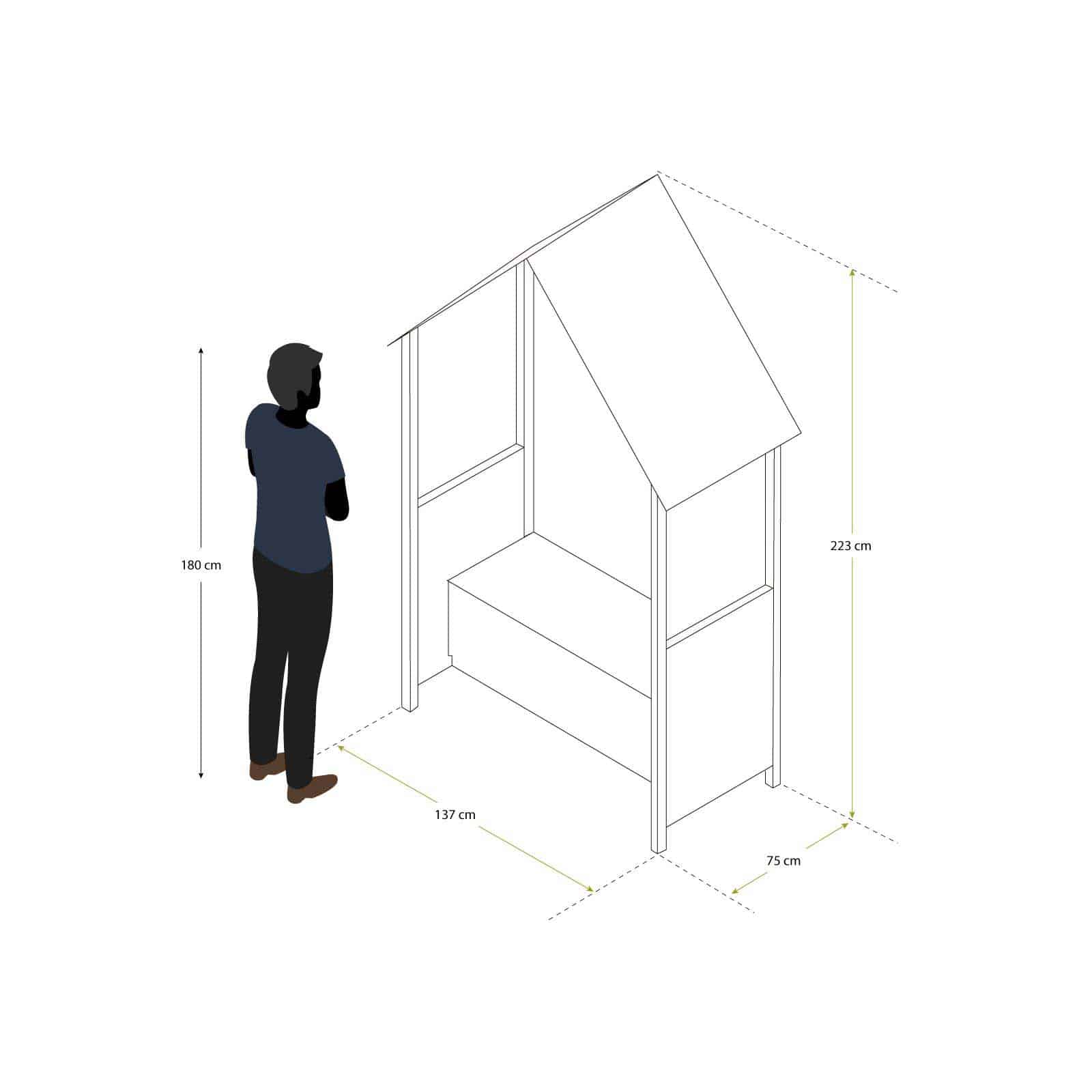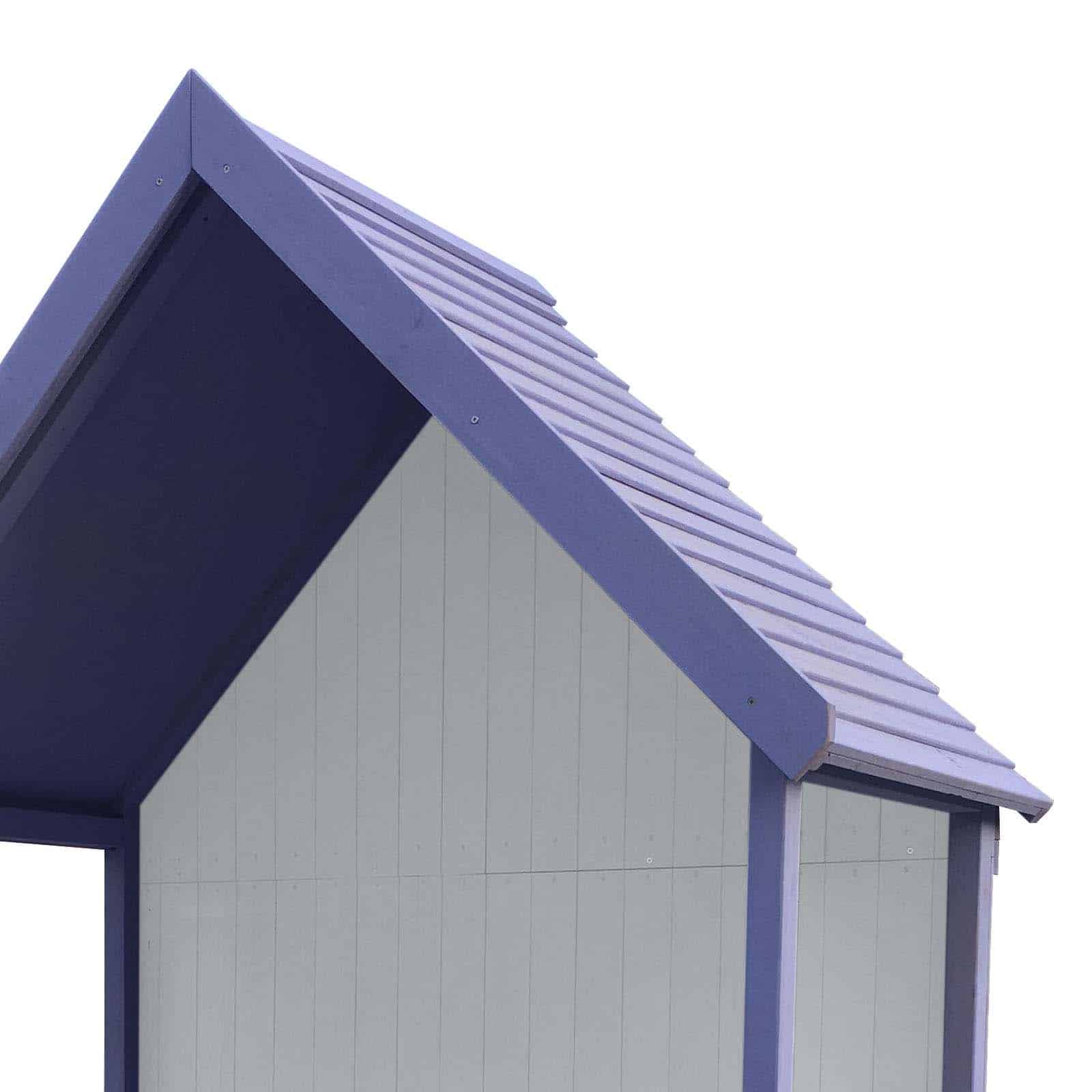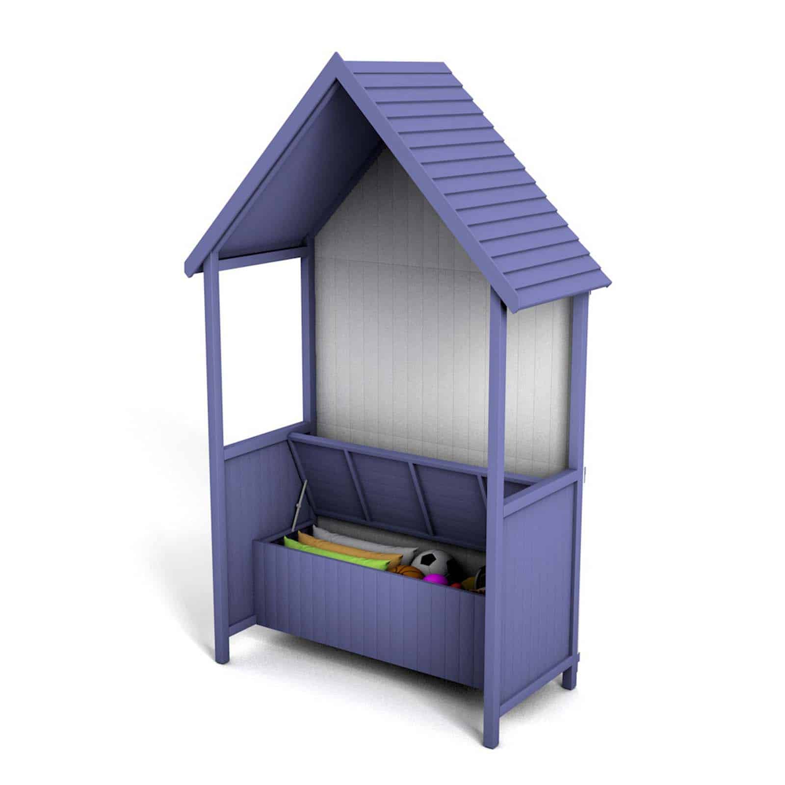Marquesina con banco y baúl hecha en madera de color morado. Tiene un techo a dos aguas. Un asiento con respaldo y con una tapa abatible para acceder al interior de su baúl. Sus líneas limpias les dan un toque elegante a los espacios exteriores.