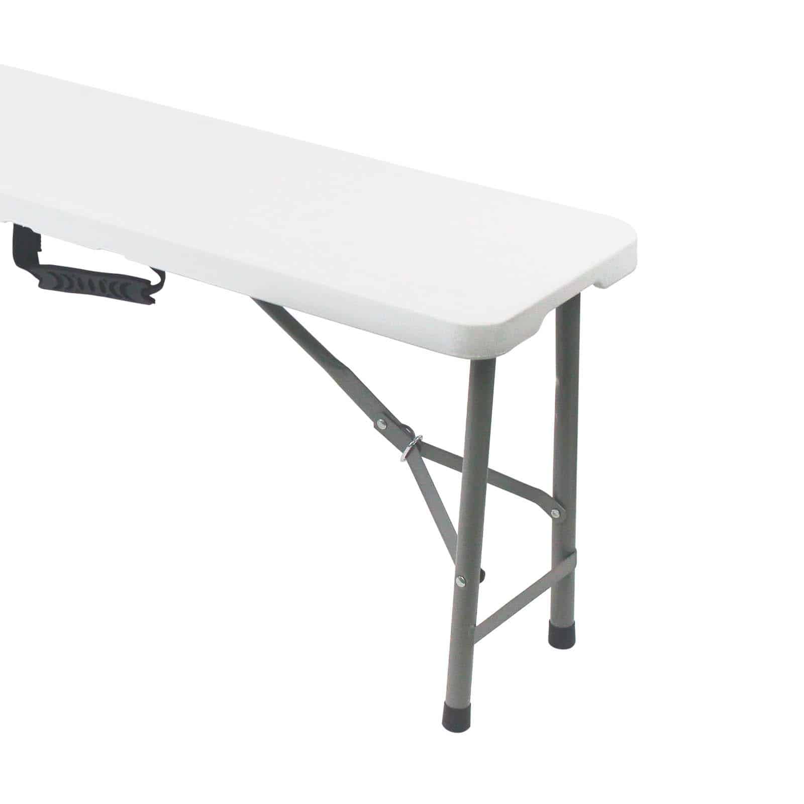 Conjunto de 2 bancos plegables. Con estructura de acero y tablero de resina de polietileno. Soportan hasta 300kg por unidad. Con protección UV y anticorrosión. Fácil transporte con asa lateral y sistema de bloqueo. Con capacidad para 8 personas.