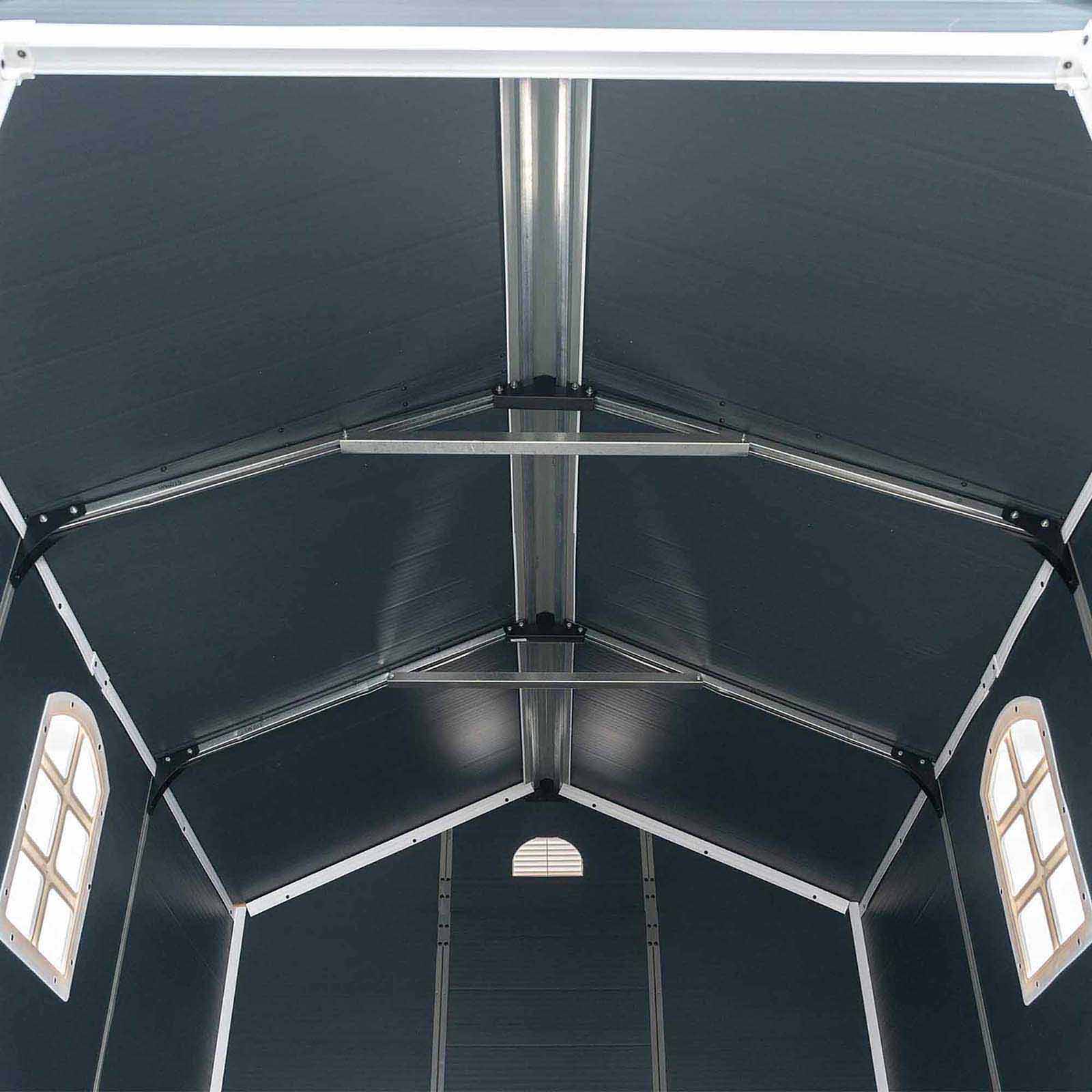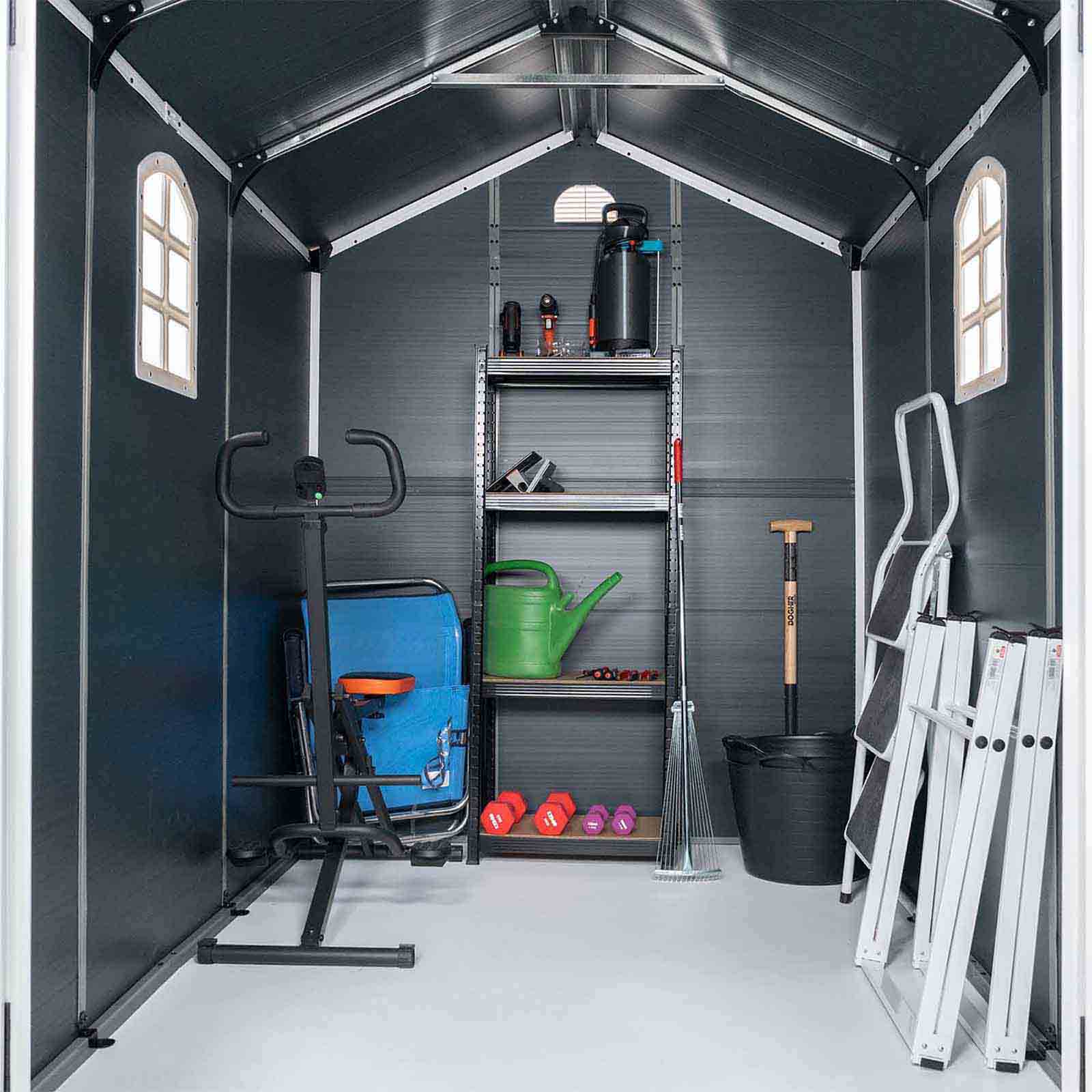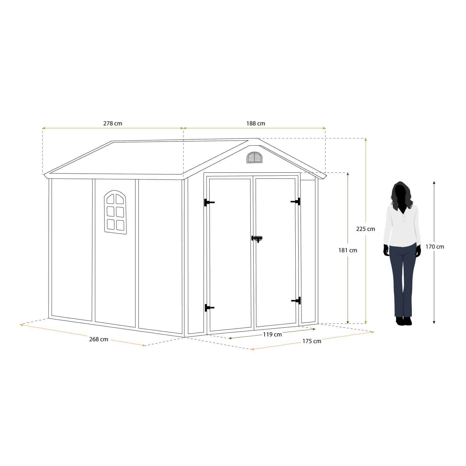 Con unas dimensiones exteriores de 188 x 278 x 225 cm, y una superficie interior útil de 175 x 268 cm, tendrás espacio suficiente para guardar desde herramientas de jardinería hasta bicicletas o cortacéspedes.