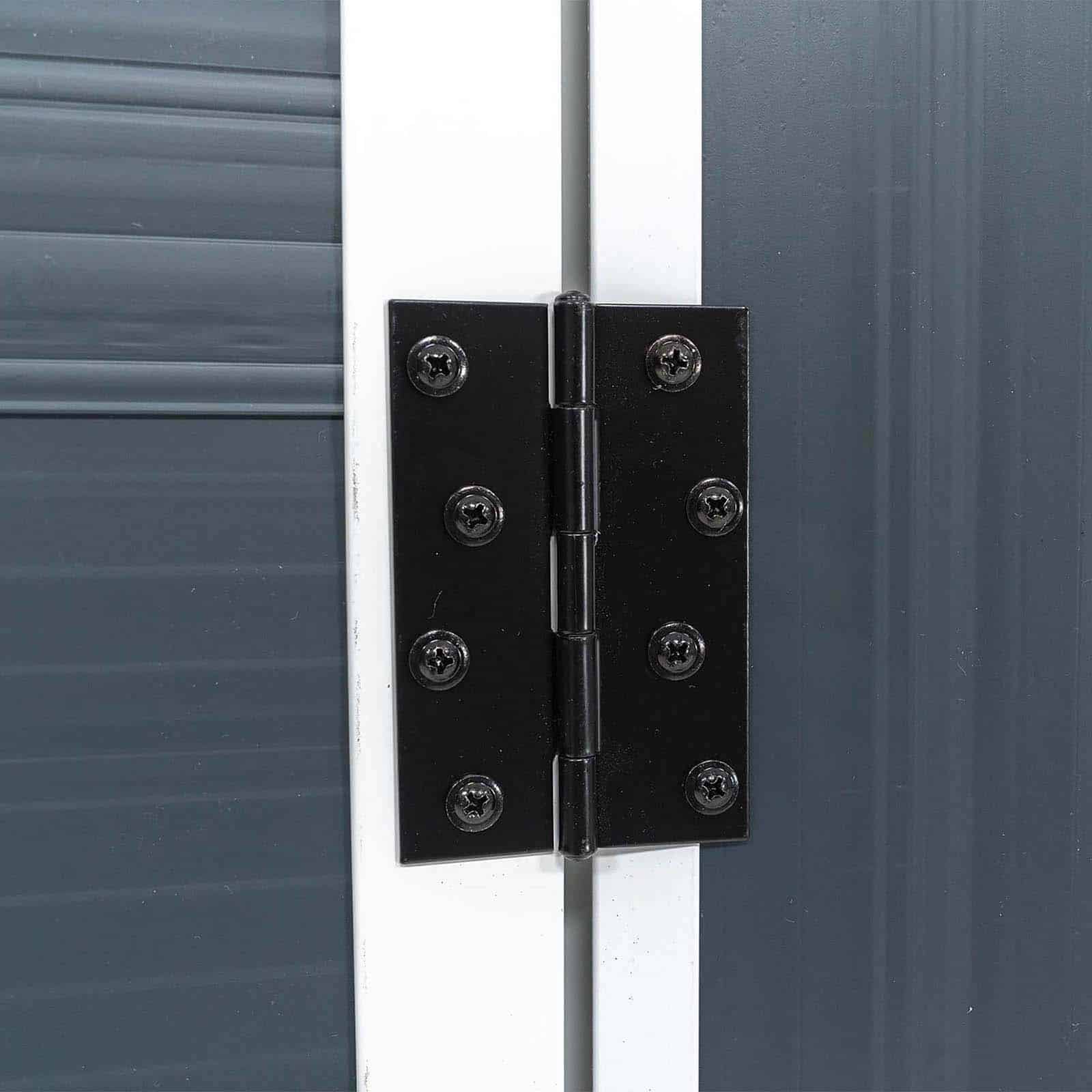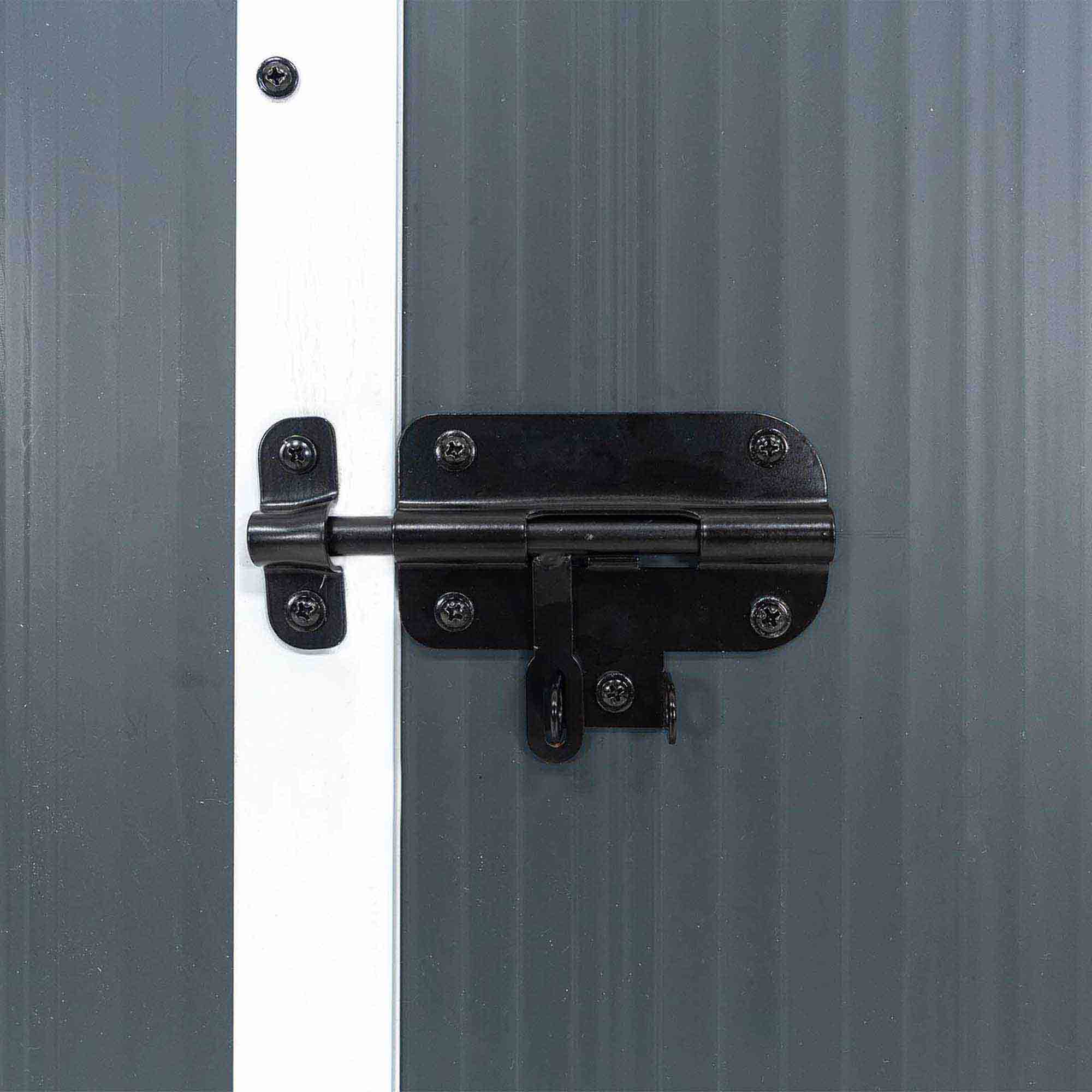 La puerta doble abatible (119 x 181 cm) facilita el acceso con objetos grandes y el sistema de cierre con pasador metálico permite instalar un candado (no incluido) para mayor seguridad.