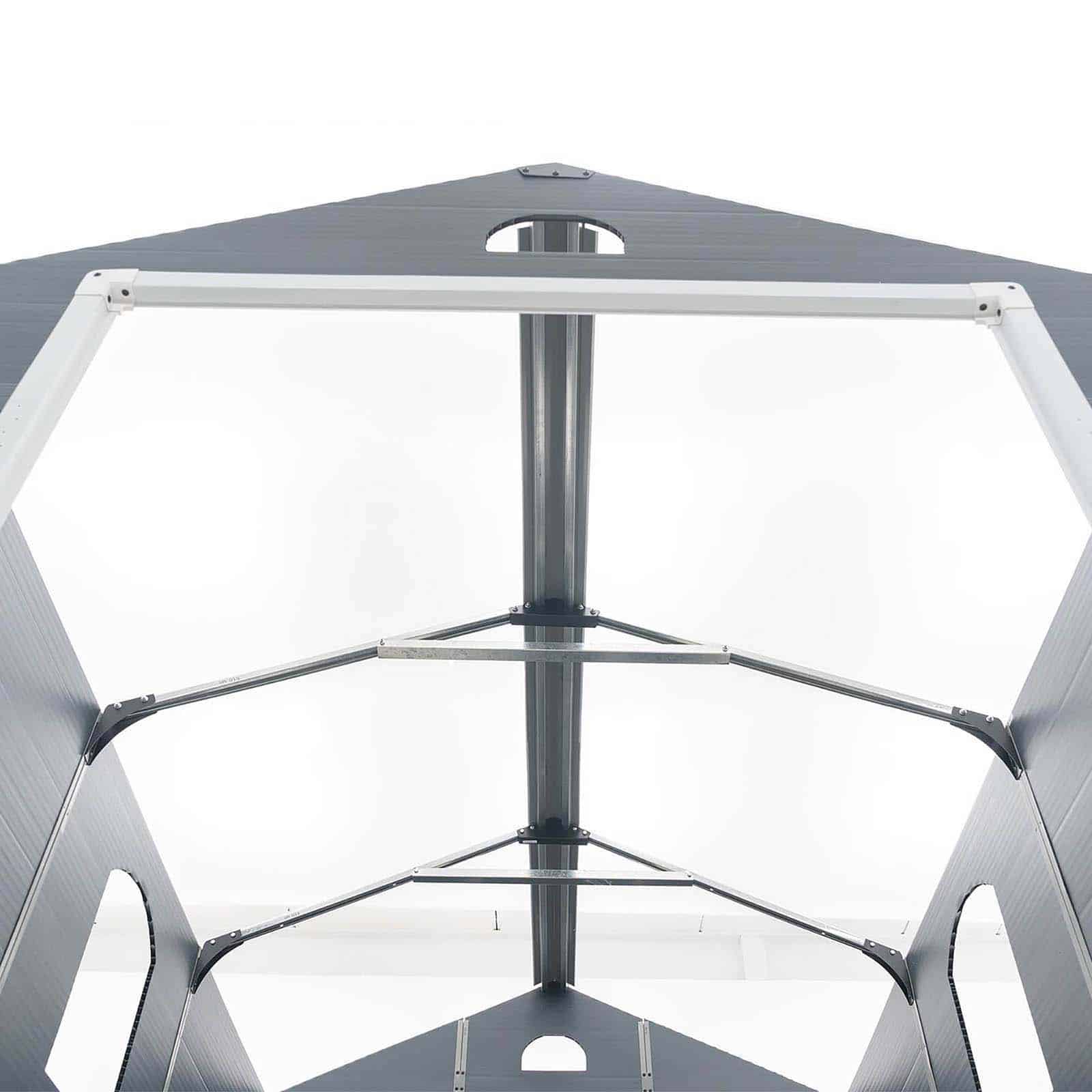 El tejado a dos aguas no solo mejora el diseño, sino que es funcional: evita acumulaciones de agua o nieve, prolongando la vida útil de la estructura. El acabado en gris antracita le da un toque moderno y se adapta visualmente a cualquier estilo de jardín.
