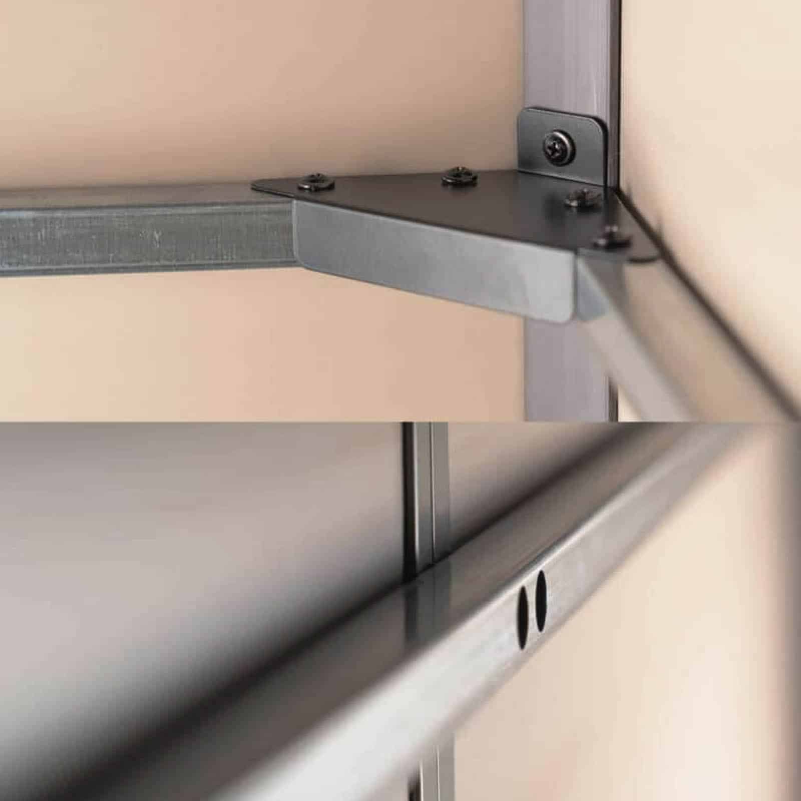 Caseta de resina tipo polipropileno tubular (grosor de pared: 12 mm). Su robustez se acentúa gracias a los refuerzos en aluminio que incorpora. El tejado a dos aguas hace que su drenaje sea eficaz. Una de sus características más destacadas es su luminosidad interior, gracias a las ventanas de policarbonato tanto frontales como laterales. Tiene una puerta doble abatible que tiene un cerrojo metálico al que se le puede incorporar un candado (no incluido). El suelo, además de aportar estabilidad a la estructura, protege el contenido de la humedad y del contacto directo con el terreno. Y, para asegurar un ambiente interno óptimo, se han integrado respiraderos.