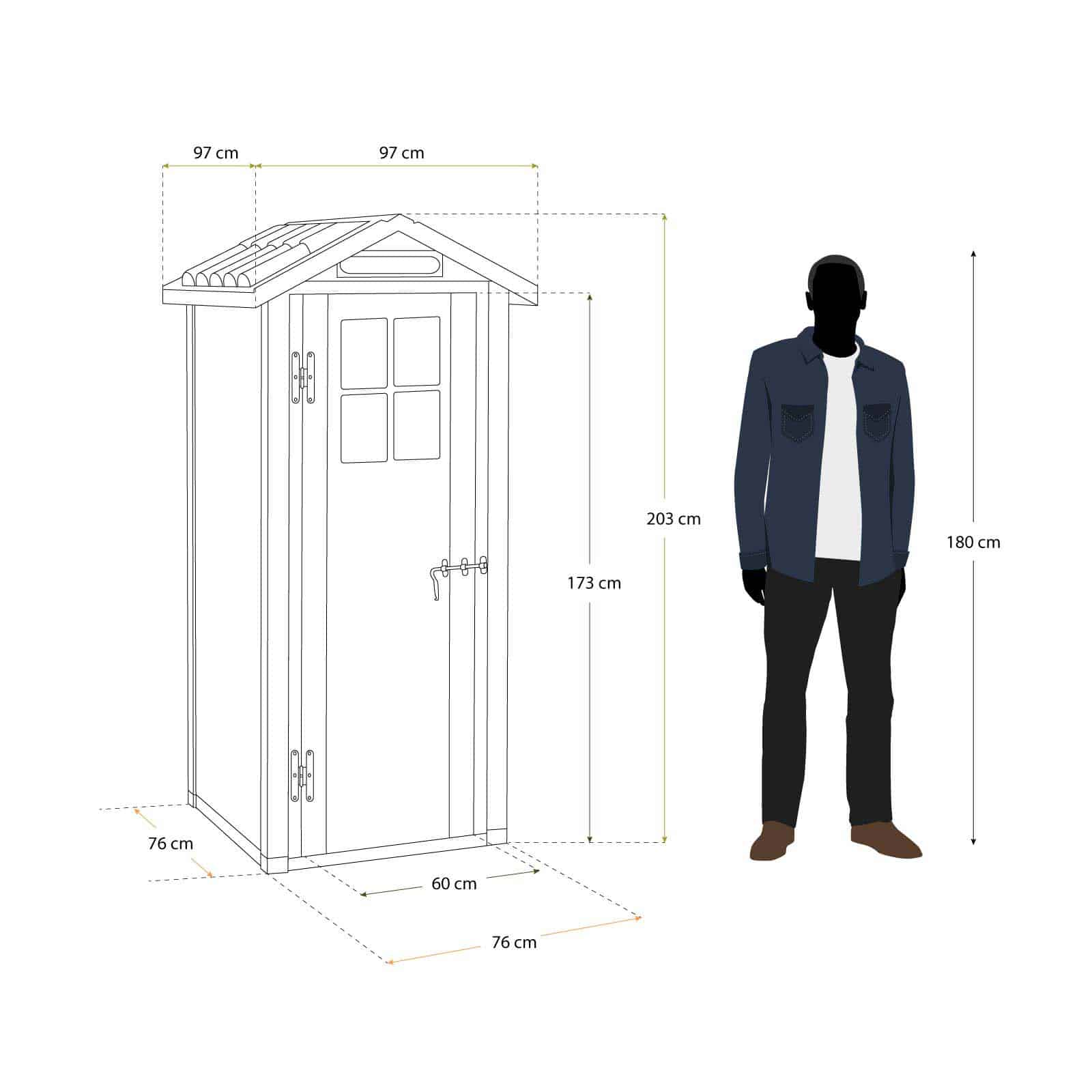Caseta de resina tipo polipropileno extrusionado (grosor de pared: 21 mm). Tiene un tejado a dos aguas para que su drenaje sea perfecto. Su cubierta imita la teja. La ventana frontal en la puerta abatible permite que el interior esté bien iluminado. Los respiraderos hacen que haya una ventilación adecuada y no se forme moho. El acceso al interior se realiza a través de una puerta abatible que viene con un cerrojo con pasador. El suelo está construido con losas de WPC de 45 mm de espesor, lo que proporciona una base robusta y duradera para sus herramientas y otros artículos.