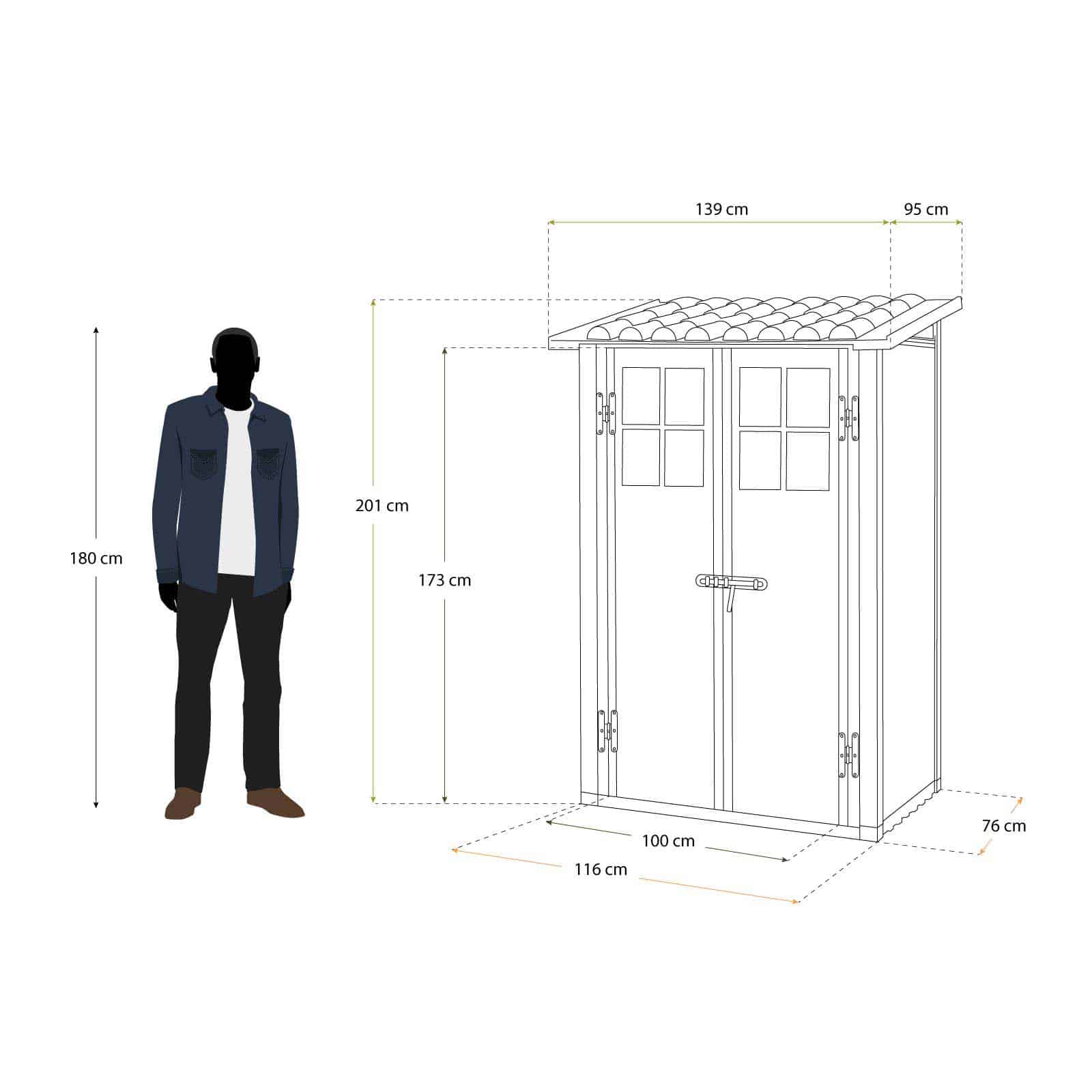 Caseta de resina tipo polipropileno extrusionado (grosor de pared: 21 mm), lo que la hace ser capaz de resistir las variaciones climáticas y prolongar la vida útil de lo almacenado. Sus dos puertas abatibles ofrecen un acceso cómodo y amplio. Vienen con dos ventanas frontales, lo que proporciona luz natural al interior. El cerrojo metálico es apto para un candado (no incluido). Una de las características más destacadas es su suelo de losas de WPC con un espesor de 45 mm. Este tipo de suelo no solo proporciona una base sólida y resistente, sino que también añade un toque de elegancia al conjunto. Su cubierta es a un agua que es perfecto para su colocación contra un muro y para la rápida evacuación de agua, evitando su acumulación y posibles daños a largo plazo.