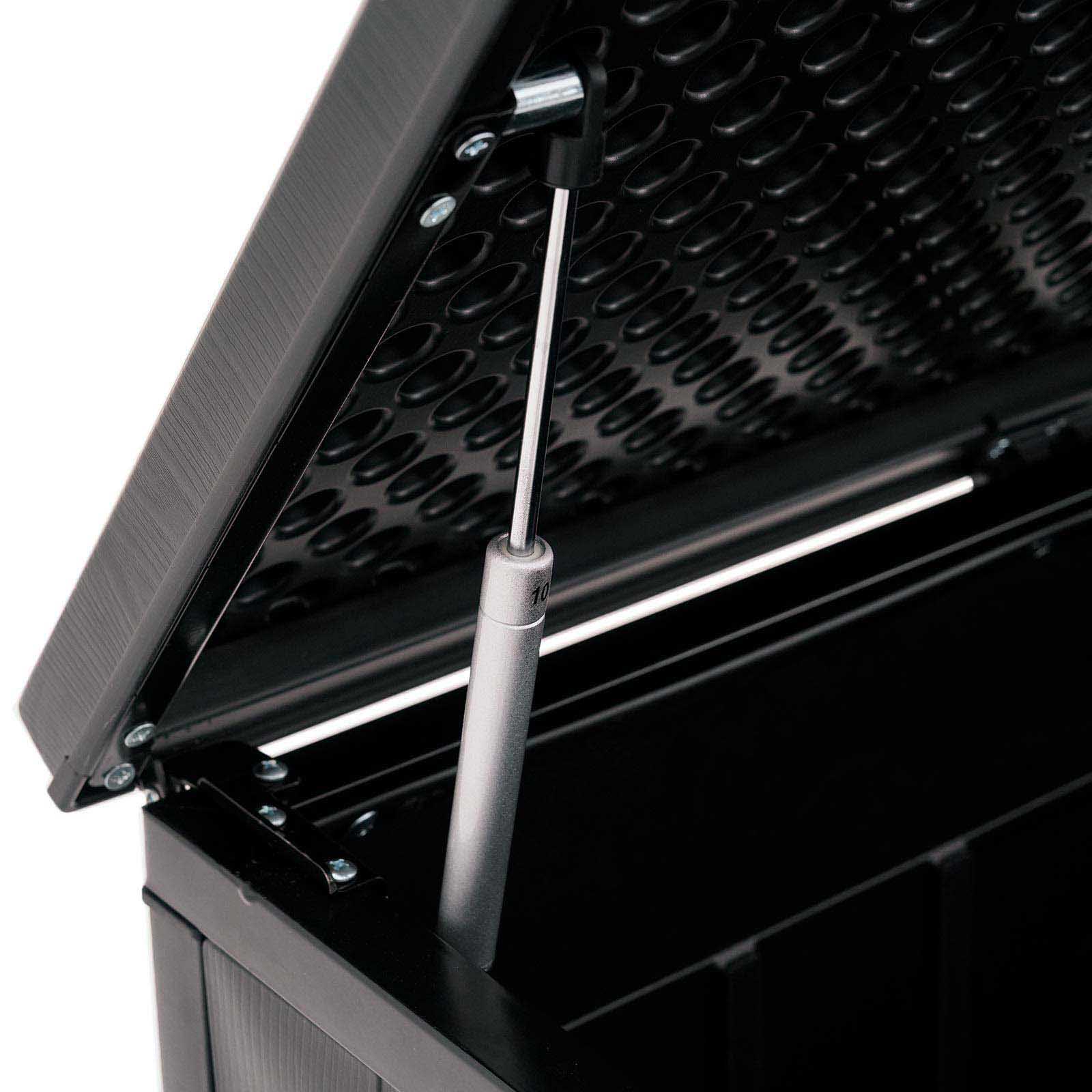 El arcón de resina Soften gris de 775 litros es ideal para almacenar herramientas, mobiliario de jardín o accesorios de piscina. Cuenta con doble puerta abatible y tapa superior con amortiguadores que facilitan el acceso a su interior. Incluye suelo integrado para mayor protección contra la humedad y un sistema de cierre con preinstalación para candado (no incluido). Fabricado en polipropileno de alta resistencia, es perfecto para terrazas y patios.