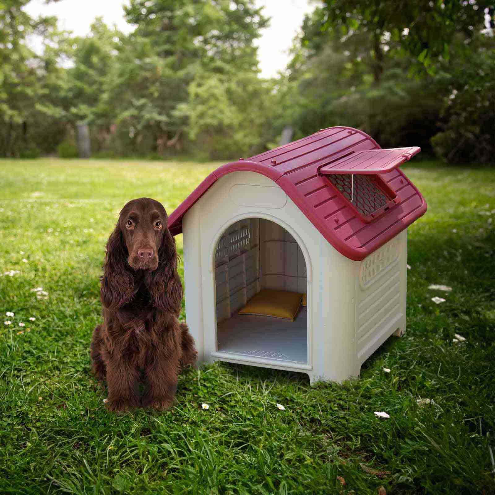 Caseta para perro mediano hecha en resina. Tejado a dos aguas con rejillas de ventilación. Ventana en tejado y suelo elevado. Uso exterior.