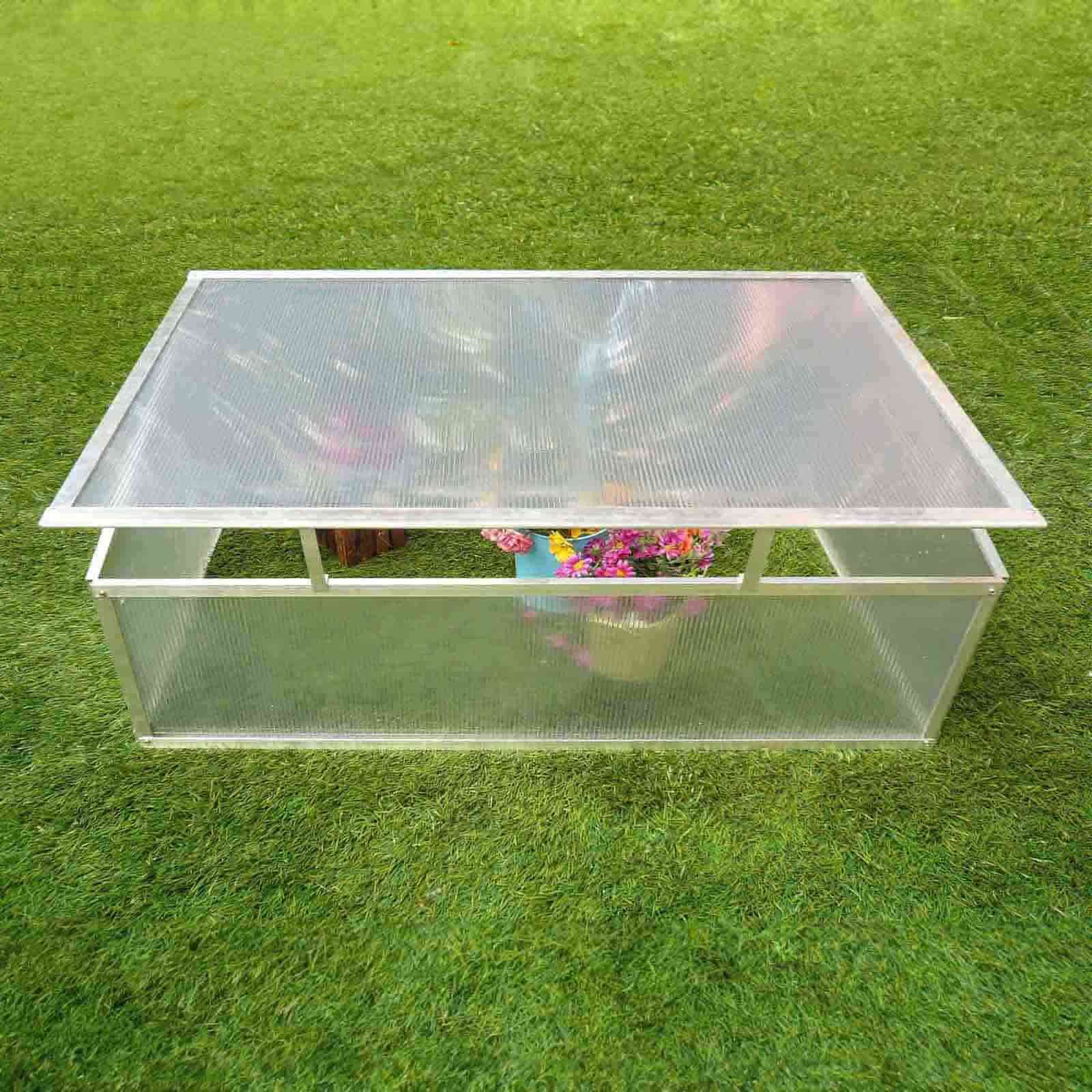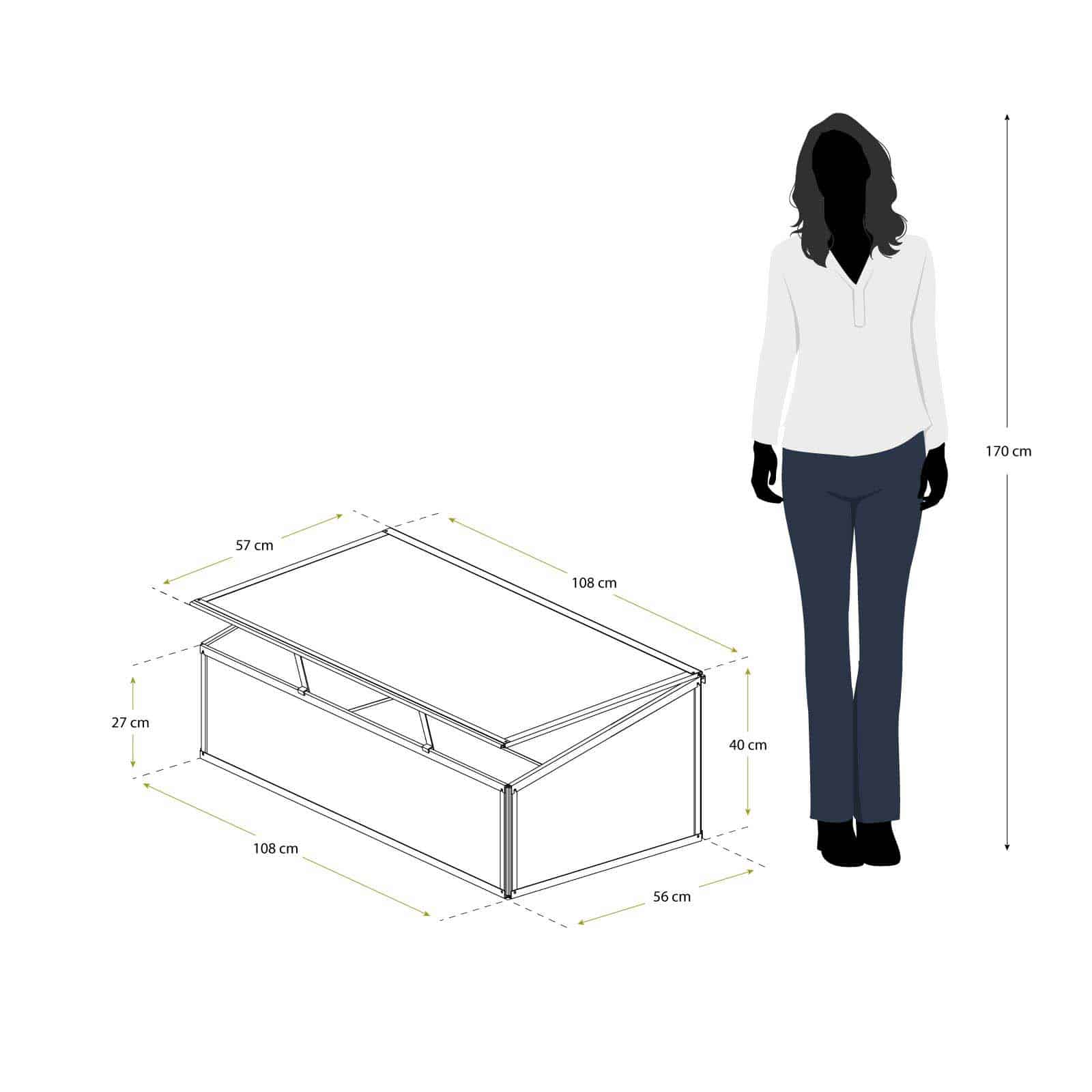 Invernadero horizontal compacto de policarbonato y estructura de aluminio (56x108x40 cm). Tapa elevable para fácil acceso y ventilación. Ligero y portátil, ideal para terrazas y espacios reducidos. Mantiene una temperatura interior hasta 5°C superior a la exterior, promoviendo un crecimiento óptimo de las plantas. No incluye base ni sistema de fijación.