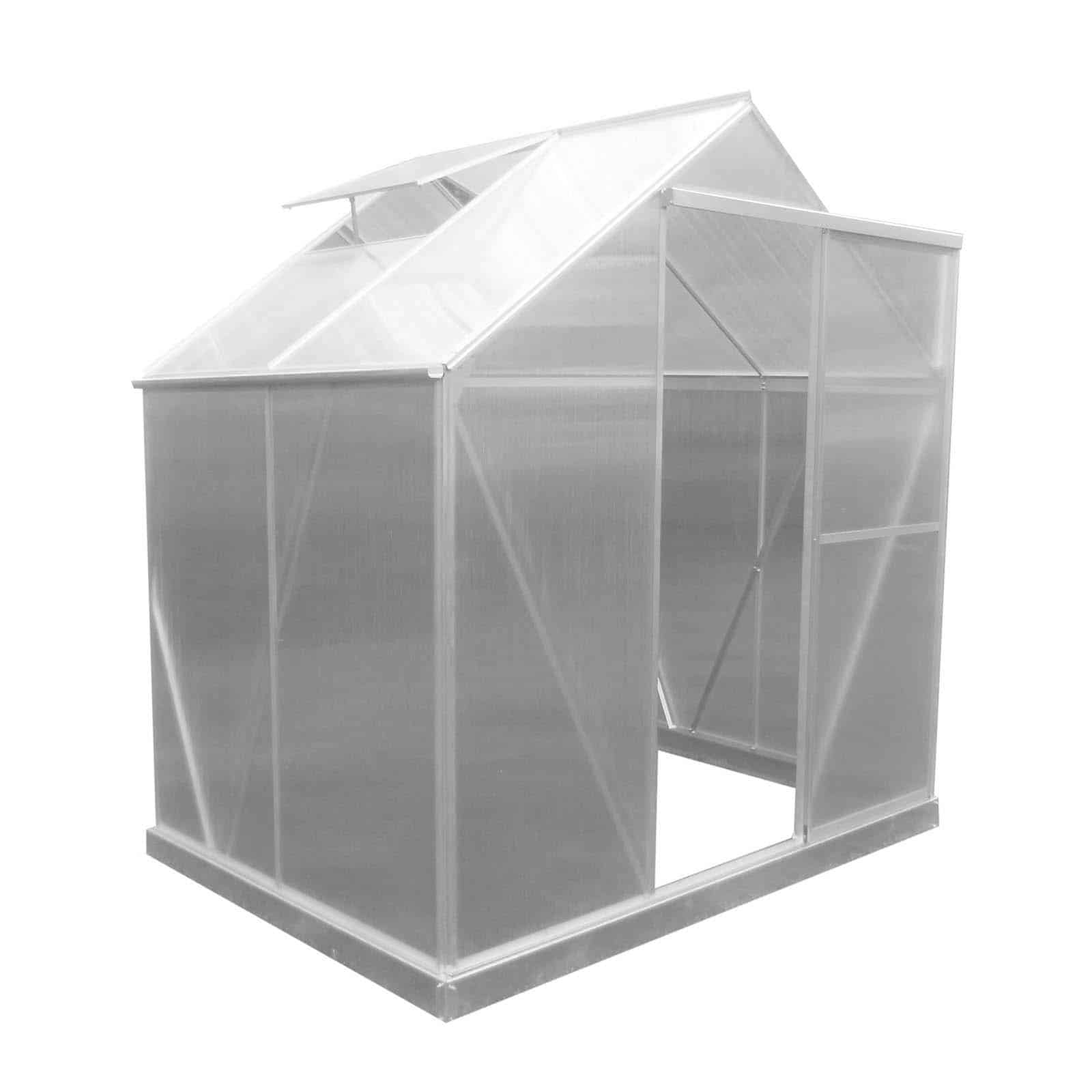 Invernadero en policarbonato y aluminio. Con paneles de 4 mm de espesor con protección UV. Estructura robusta con base de acero galvanizado para fijación al suelo. Ventana superior para ventilación y puerta frontal deslizante anti-viento.