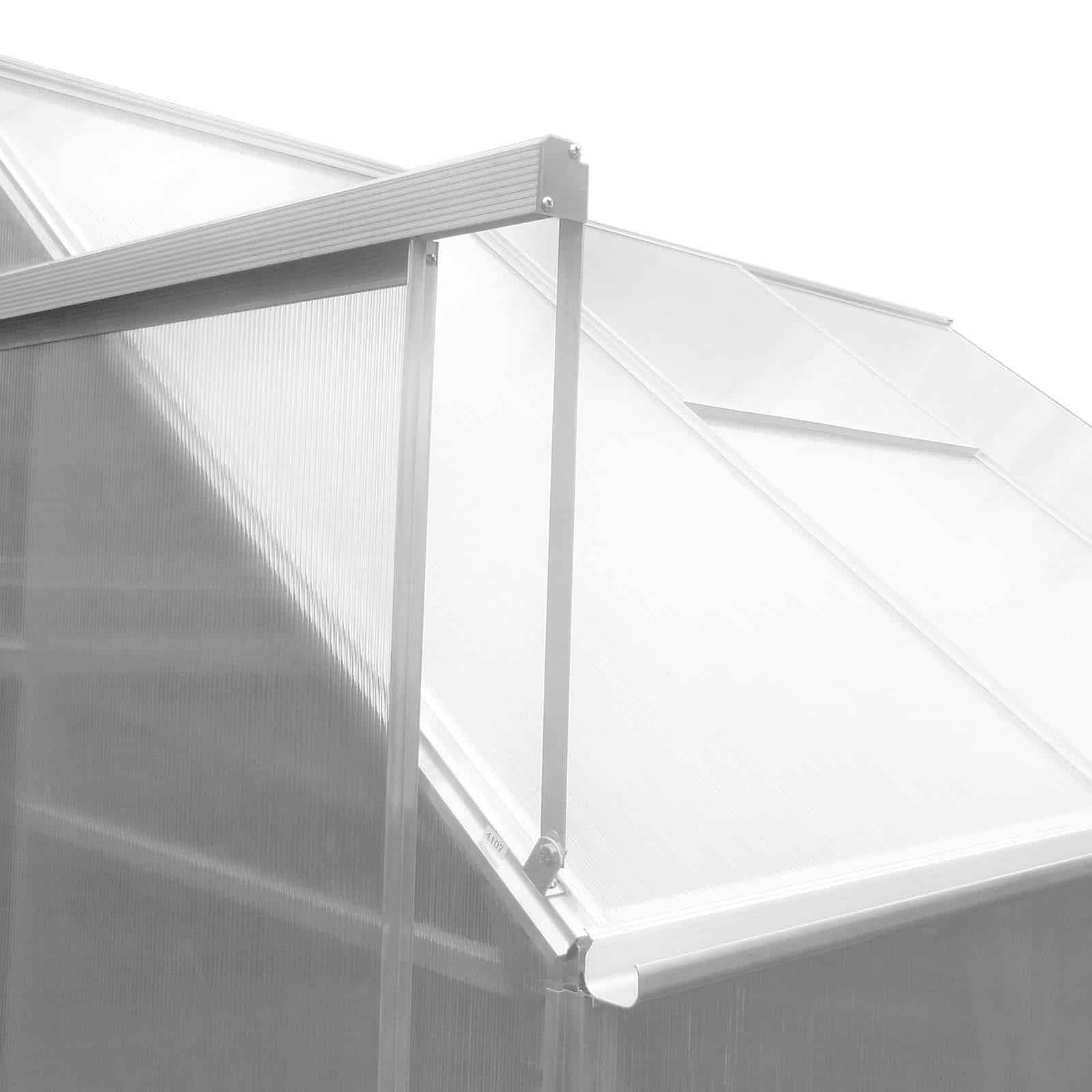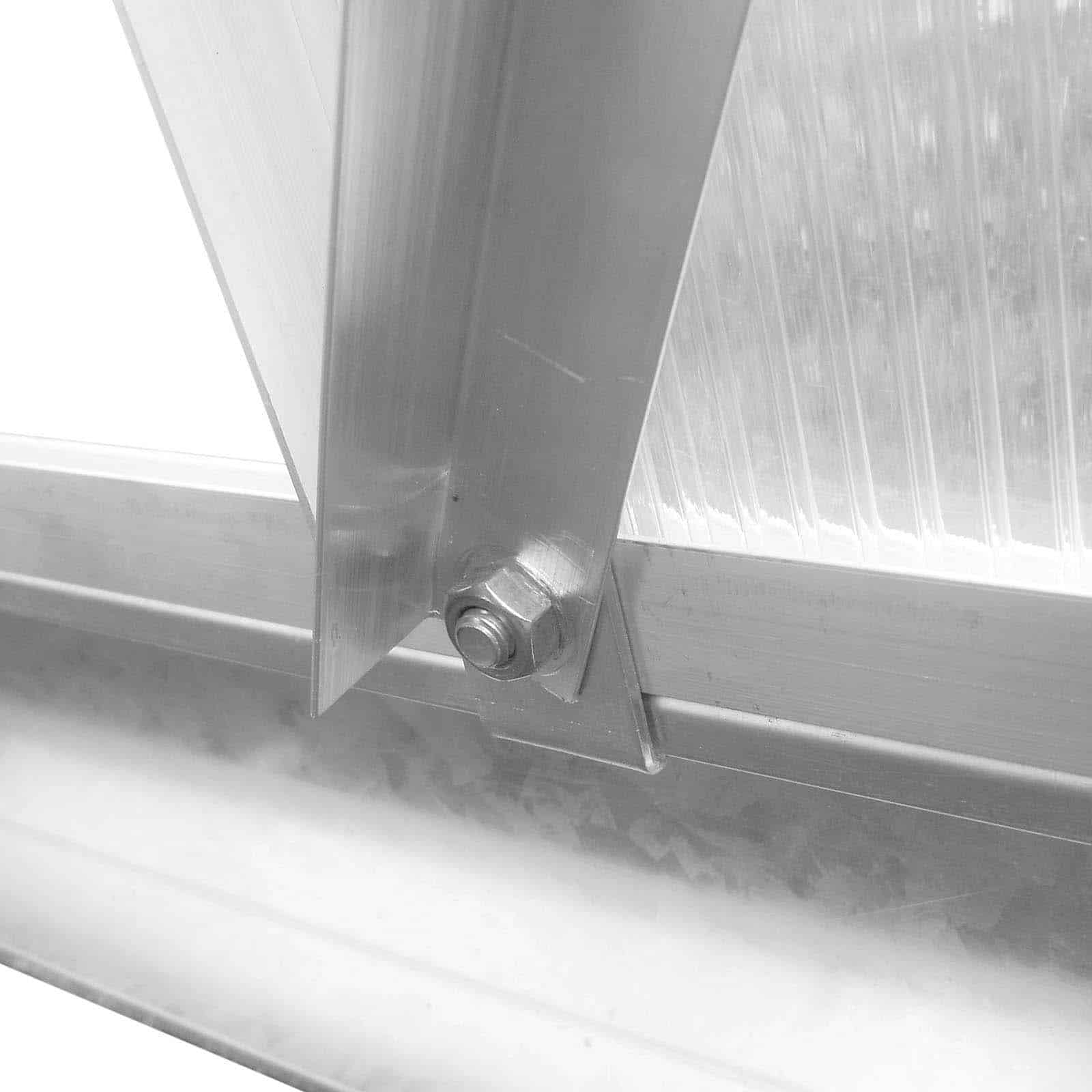 Este invernadero está fabricado con paneles de policarbonato de 4 mm de espesor cuenta con una protección especial contra los rayos ultravioletas, garantizando una mayor durabilidad y resistencia. Una característica distintiva de este modelo es su ventana en la parte superior, que facilita la ventilación, asegurando un intercambio de aire óptimo y evitando el sobrecalentamiento en días especialmente soleados. Asimismo, su estructura de aluminio, con un espesor que varía entre 1,0-2,4 mm, proporciona la robustez necesaria para resistir las diferentes condiciones climáticas. La base de fijación al suelo, fabricada en acero galvanizado, es otra ventaja de este invernadero, ofreciendo estabilidad y evitando que la estructura se desplace o se vea afectada por el viento. Su acceso es sumamente práctico y seguro gracias a la puerta deslizante en su parte frontal.