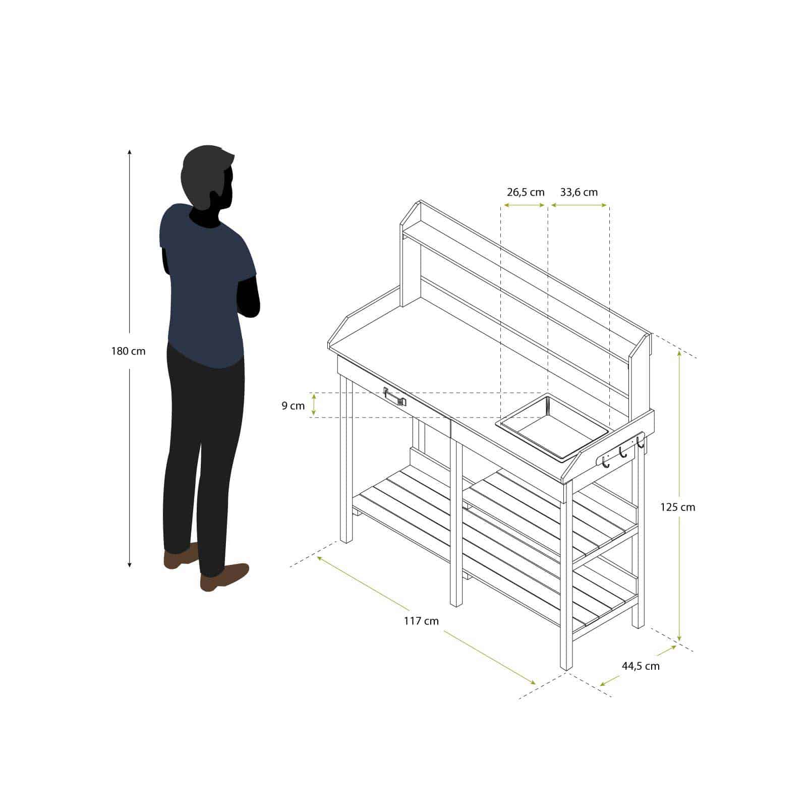 Mesa de trabajo de jardín en madera natural de 10 mm de espesor. Tratada para resistir hongos y humedad. Incluye base, bandejas inferiores, cajón para herramientas y fregadero.