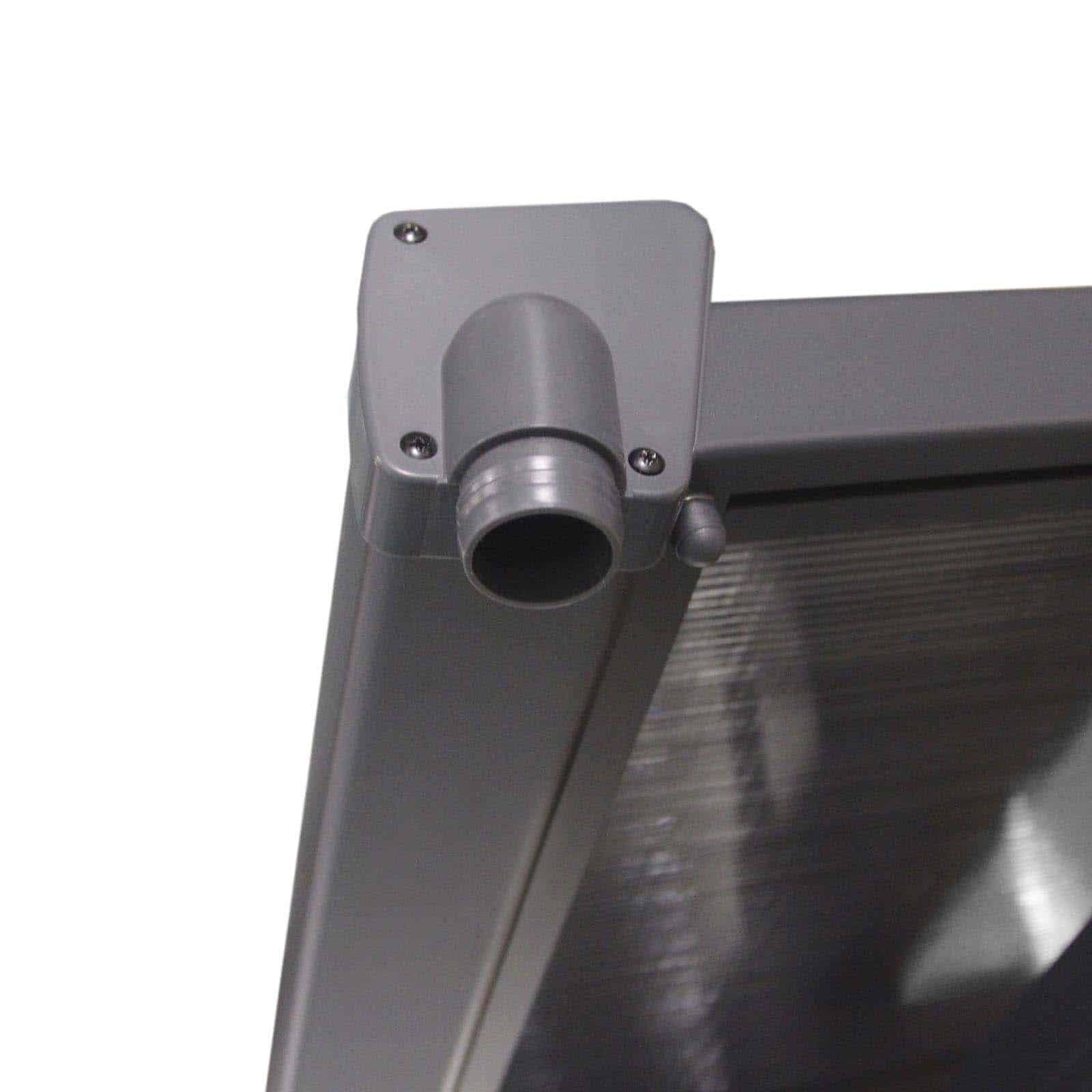Pérgola de pared en aluminio color antracita. Hecha con paneles de policarbonato de 6 mm de espesor. Sistema de drenaje incorporado. Flexibilidad de montaje con ajustes en horizontal y en profundidad. Cubre 15 metros cuadrados.