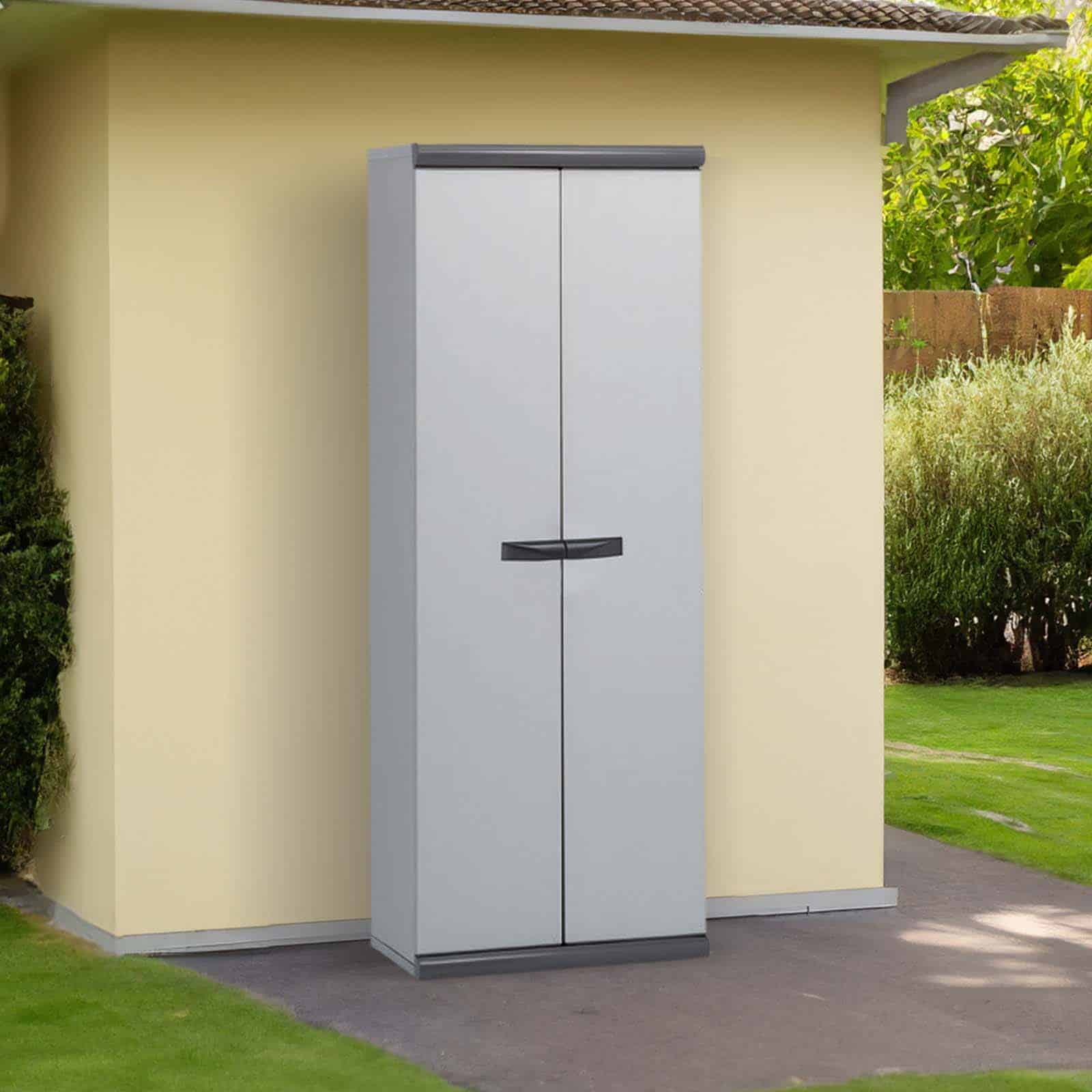 El armario alto Gardiun Coimbra es una solución práctica y duradera para organizar espacios tanto interiores como exteriores. Con unas dimensiones de 169 x 62,5 x 39 cm, está fabricado en resina tipo polipropileno extrusionado, un material resistente a la intemperie y con protección UV, ideal para su uso en jardines, terrazas o trasteros.
