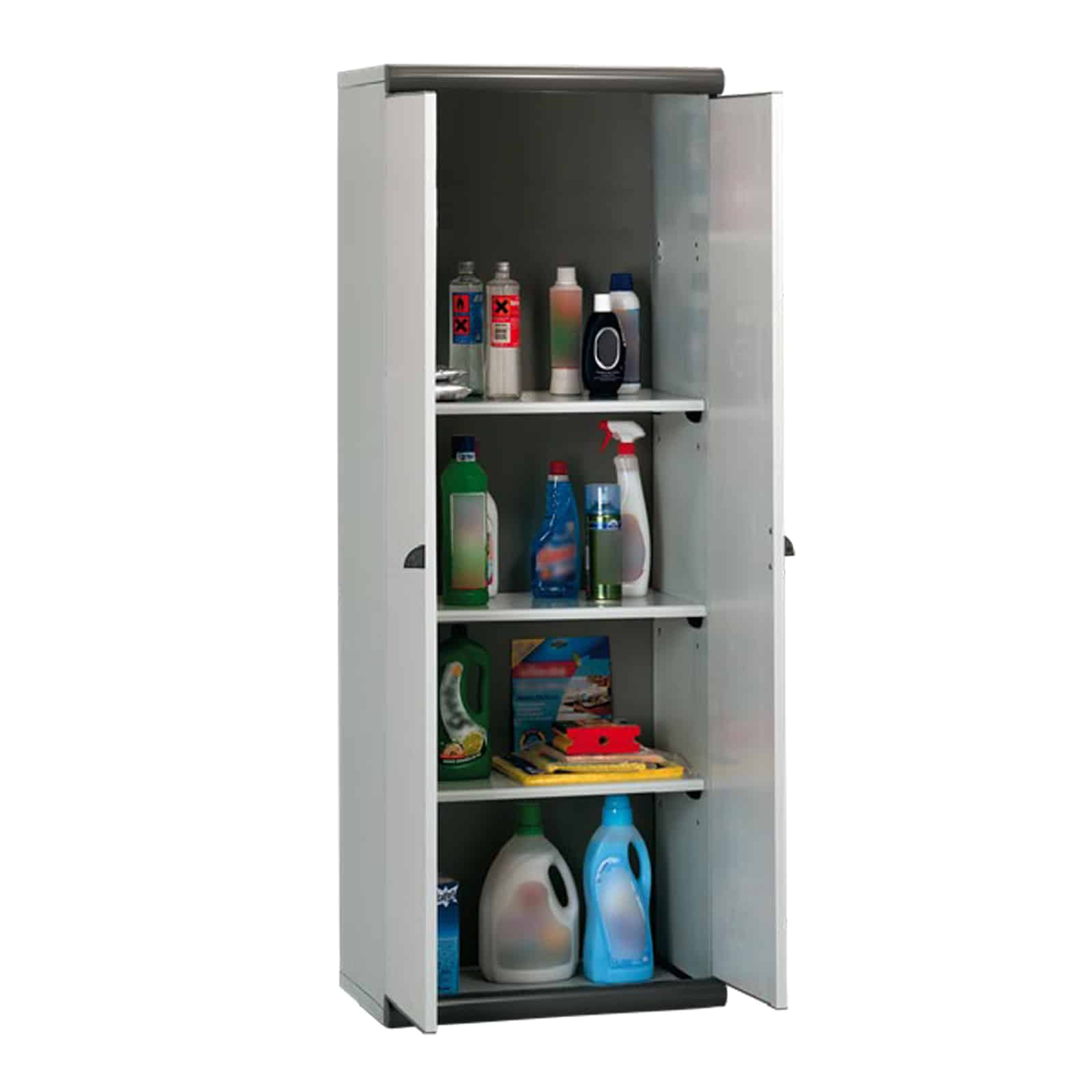 Armario de jardín en resina de polipropileno con 3 baldas regulables y puertas abatibles. Apto para interior y exterior. Medidas 169 x 62,5 x 39 cm.