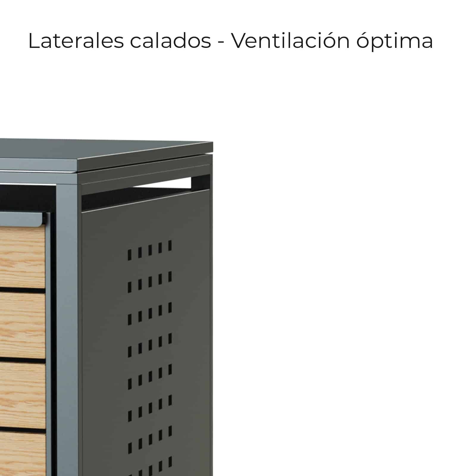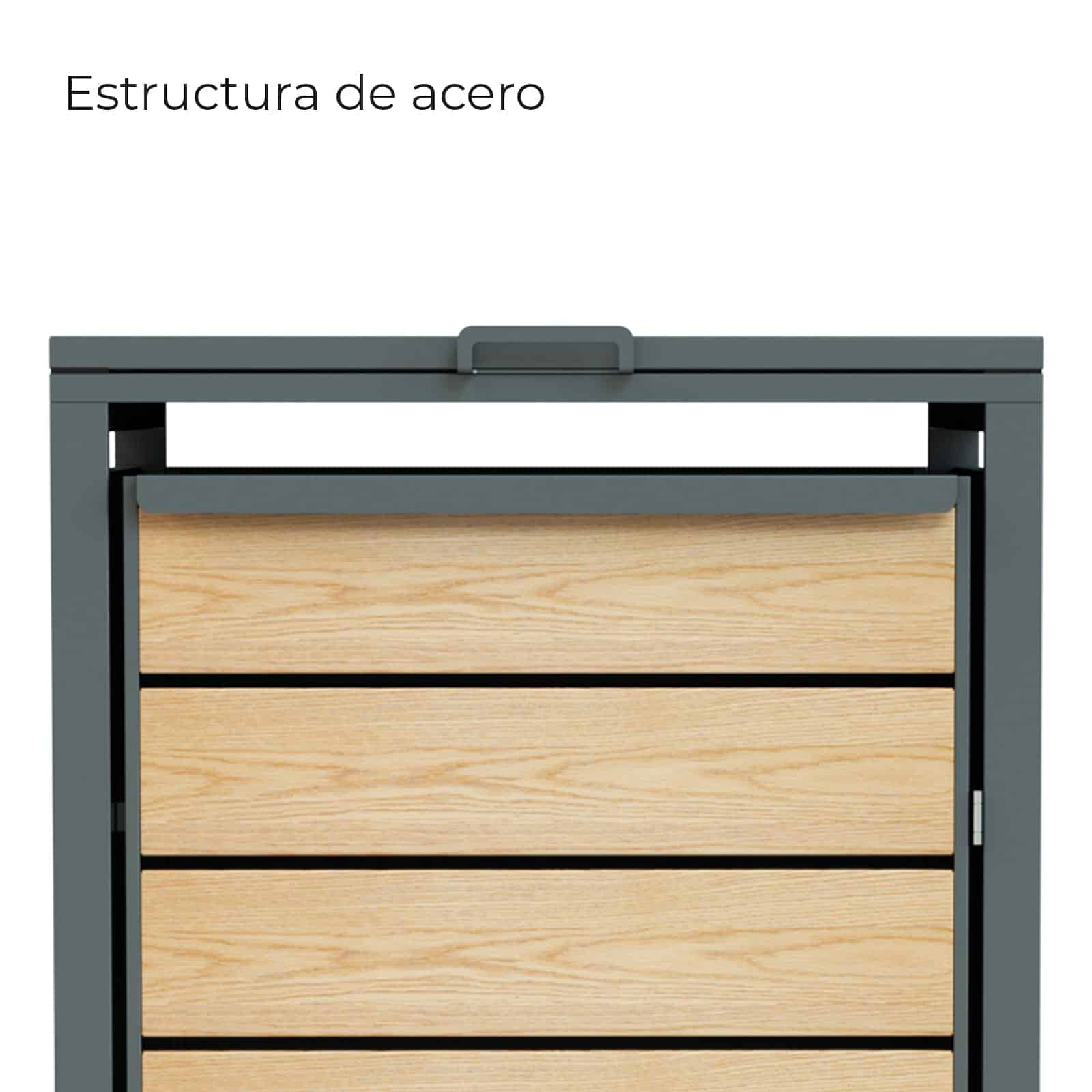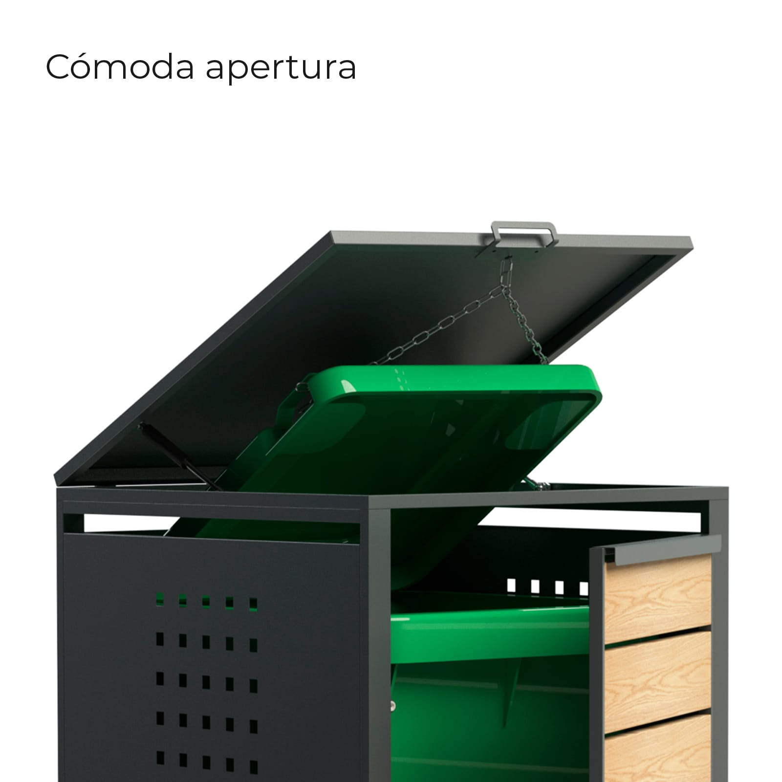 Cobertizo para cubo de reciclaje de 240 L, hecho en acero galvanizado. Su estructura es de acero inoxidable. Apertura superior a través de asa. Laterales con ventilación. Color antracita con frontal imitación madera.