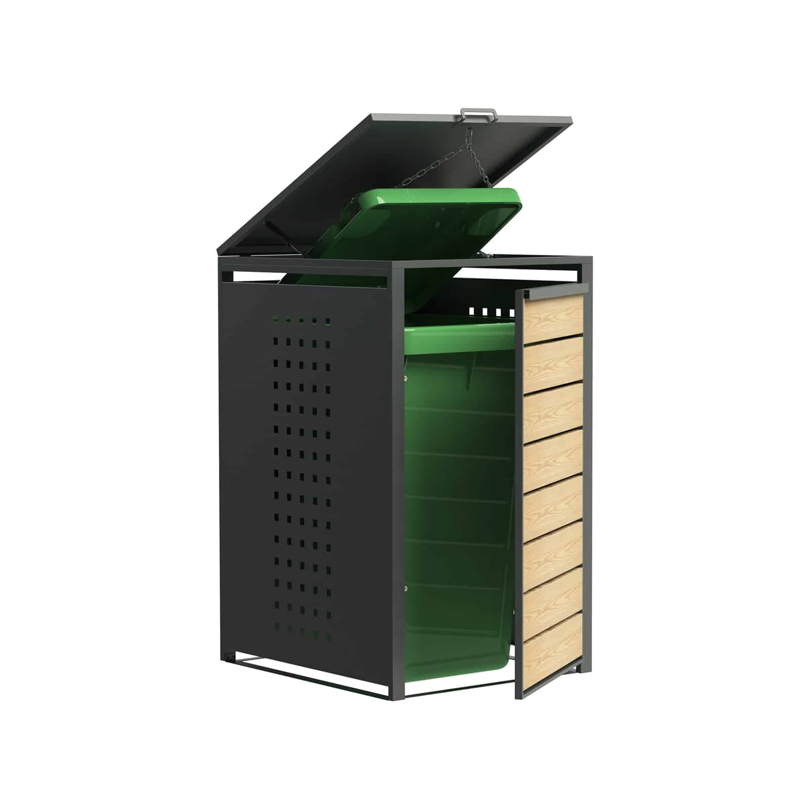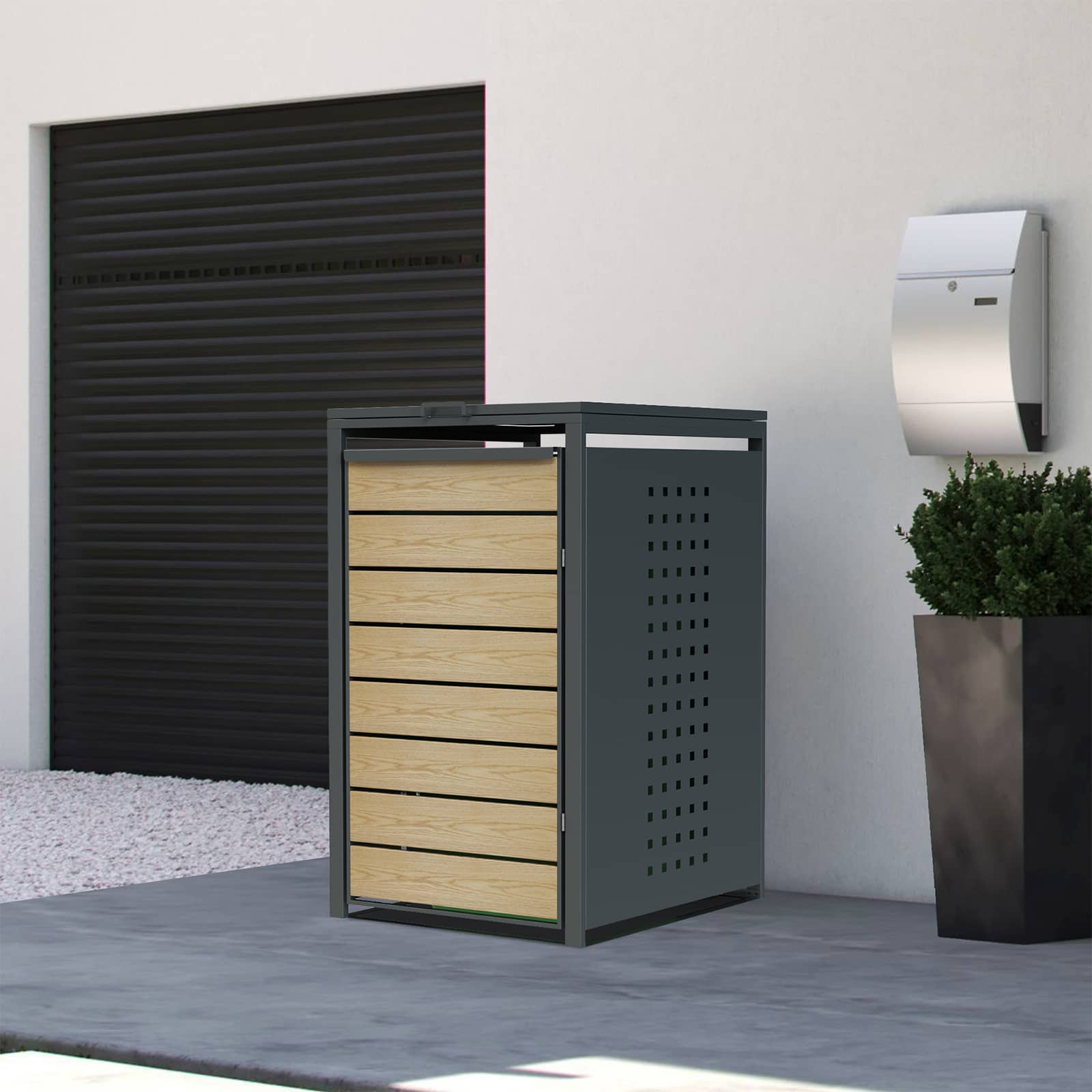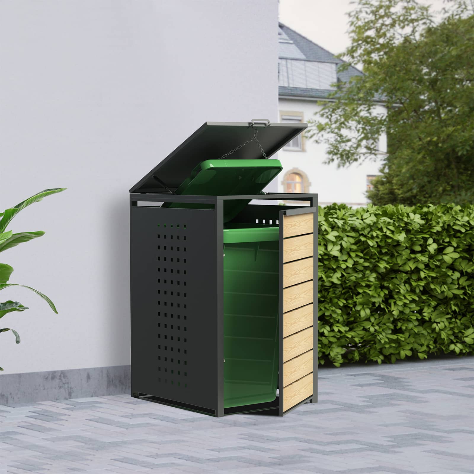 Cobertizo para cubo de reciclaje de 240 L, hecho en acero galvanizado. Su estructura es de acero inoxidable. Apertura superior a través de asa. Laterales con ventilación. Color antracita con frontal imitación madera.