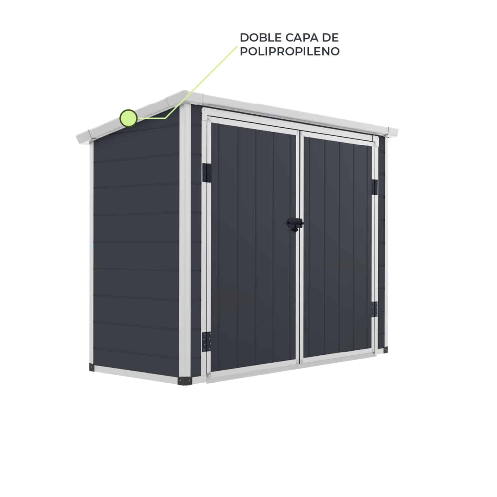 Caseta cobertizo con paredes de polipropileno y tratamiento UV & waterproof. Estructura de acero zincado. Tejado inclinado. Doble puerta frontal con sistema de bloqueo y rampa. Color: antracita. Incluye suelo.