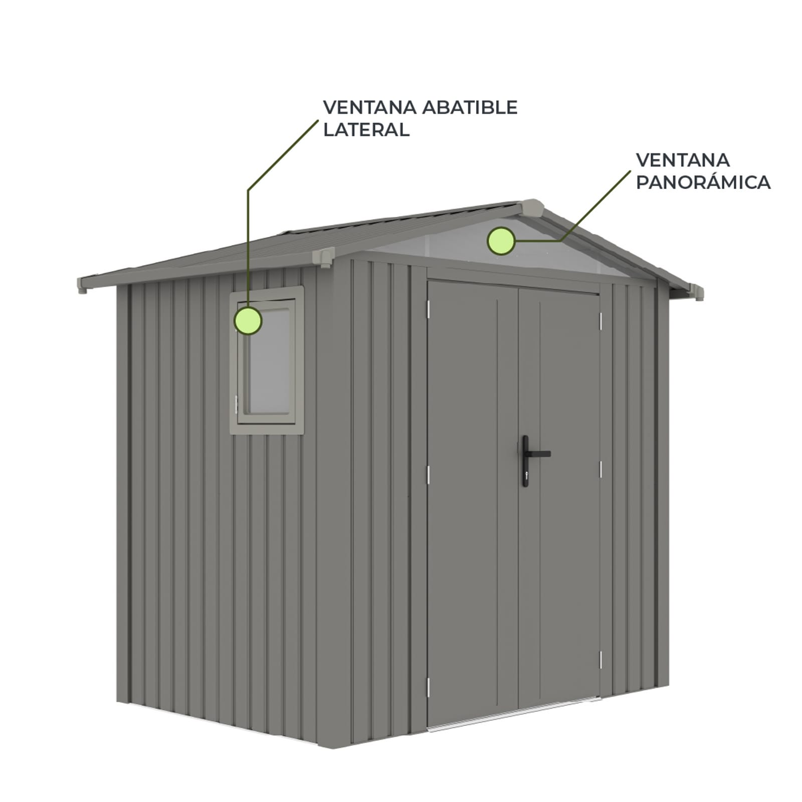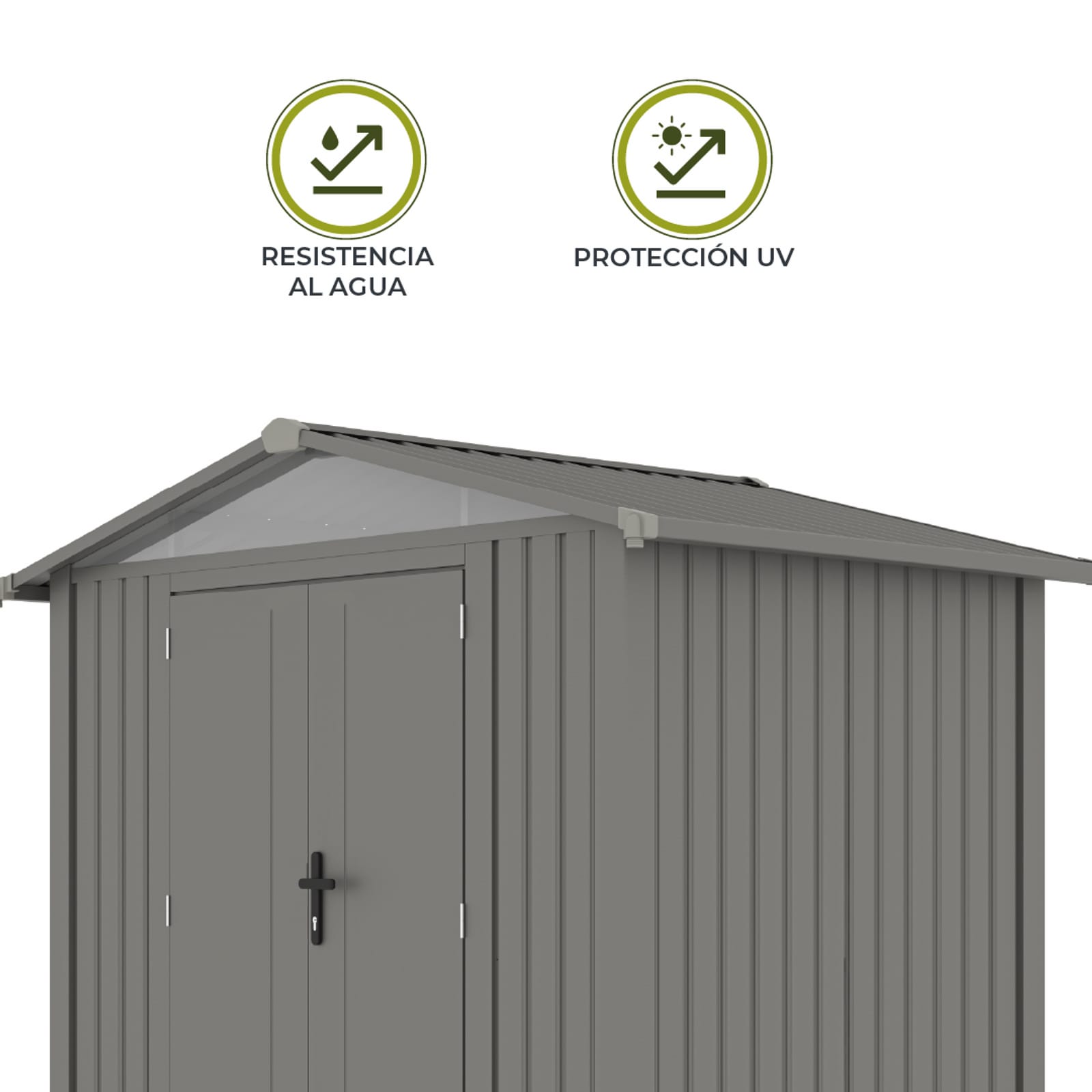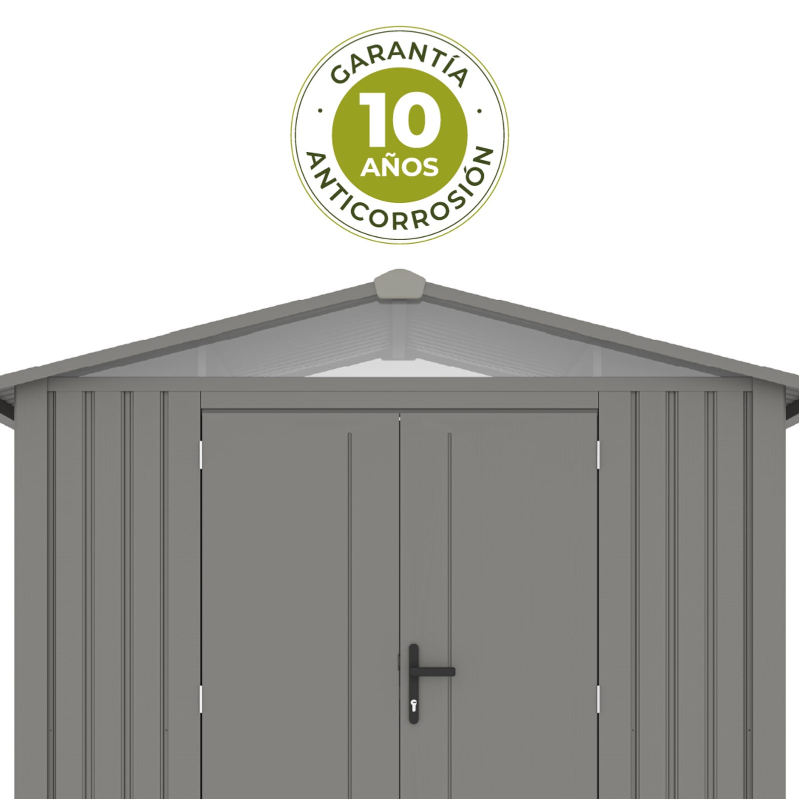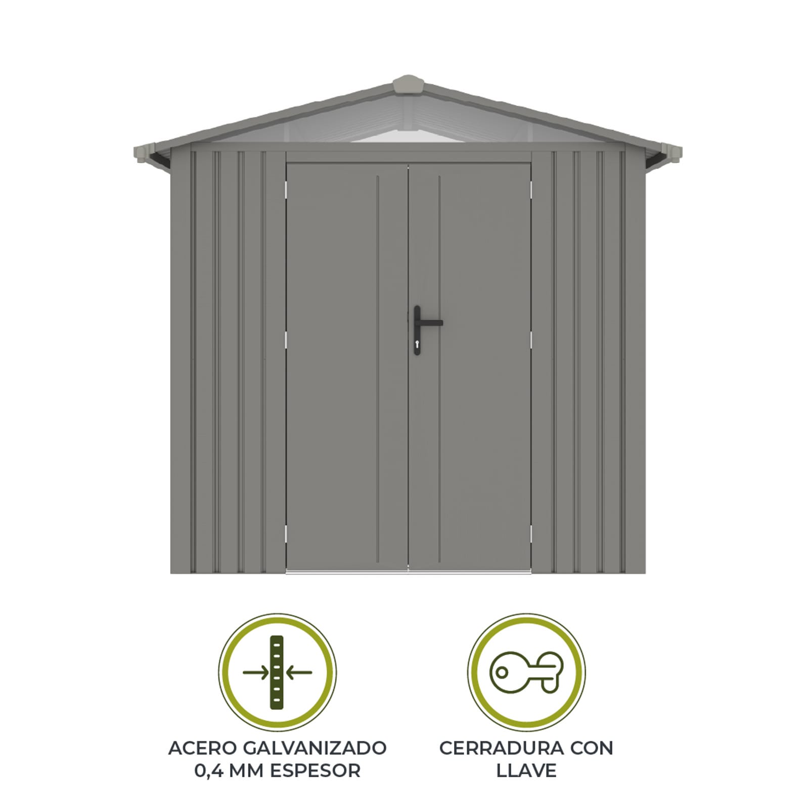 Caseta de jardín fabricada en acero galvanizado de 0,40mm. Estructura de acero zincado. Doble puerta frontal con cerradura y llave. Rampa de acceso. Tejado a dos aguas. 2 ventanas. Suelo no incluido. Color: gris plateado. 10 años de garantía anticorrosión.