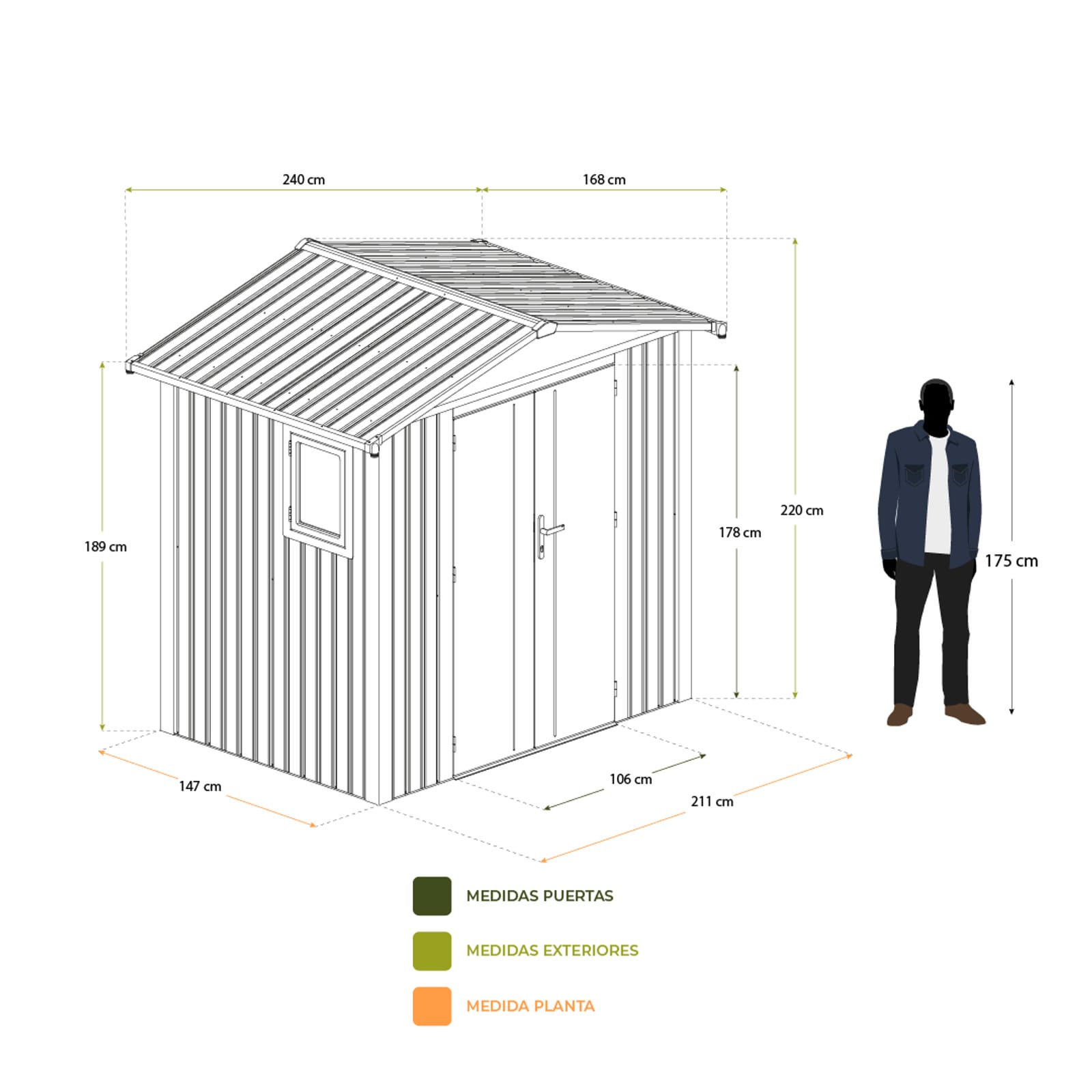 Además, cuenta con una doble puerta frontal para poder meter equipos grandes como cortacéspedes y maquinaria de jardín. Tiene una rampa para facilitar el acceso. No incluye suelo.