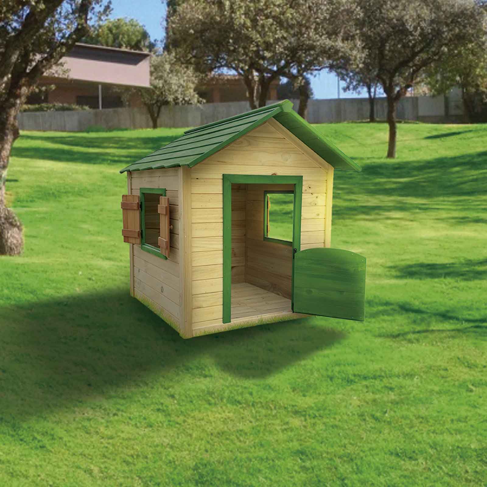 Casita infantil de exterior marca Robincool hecha en madera tratada. Tejado a dos aguas. Puerta abatible. Incluye suelo y dos ventanas. Personalizable con pinturas al agua. Cumple con la normativa EN71 de seguridad en juguetes. A partir de 3 años.