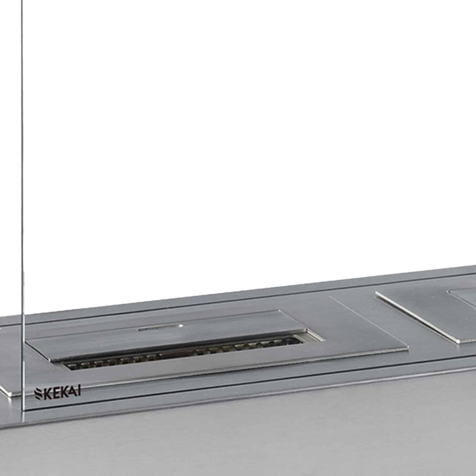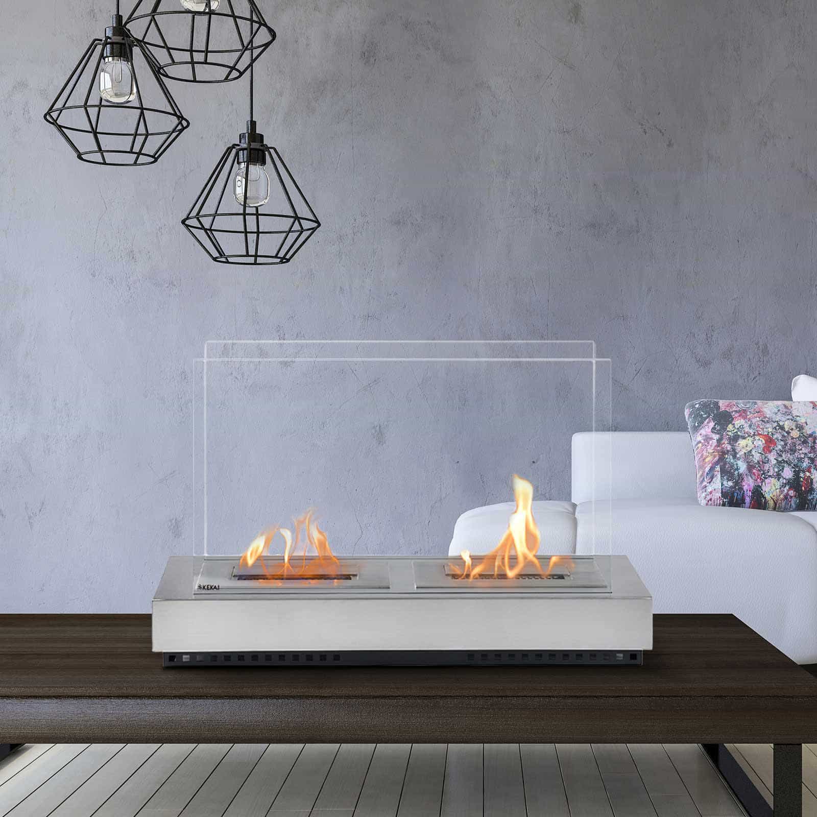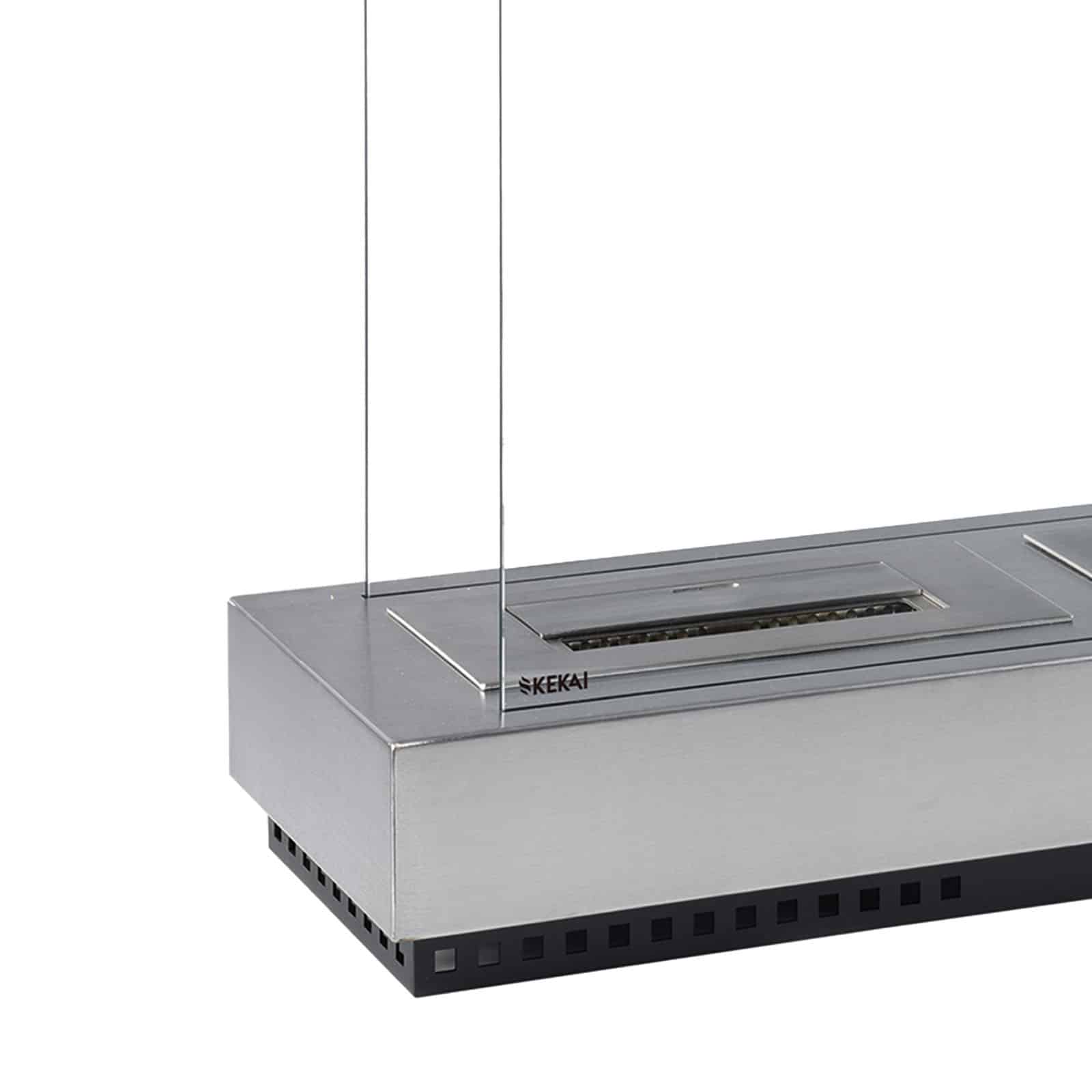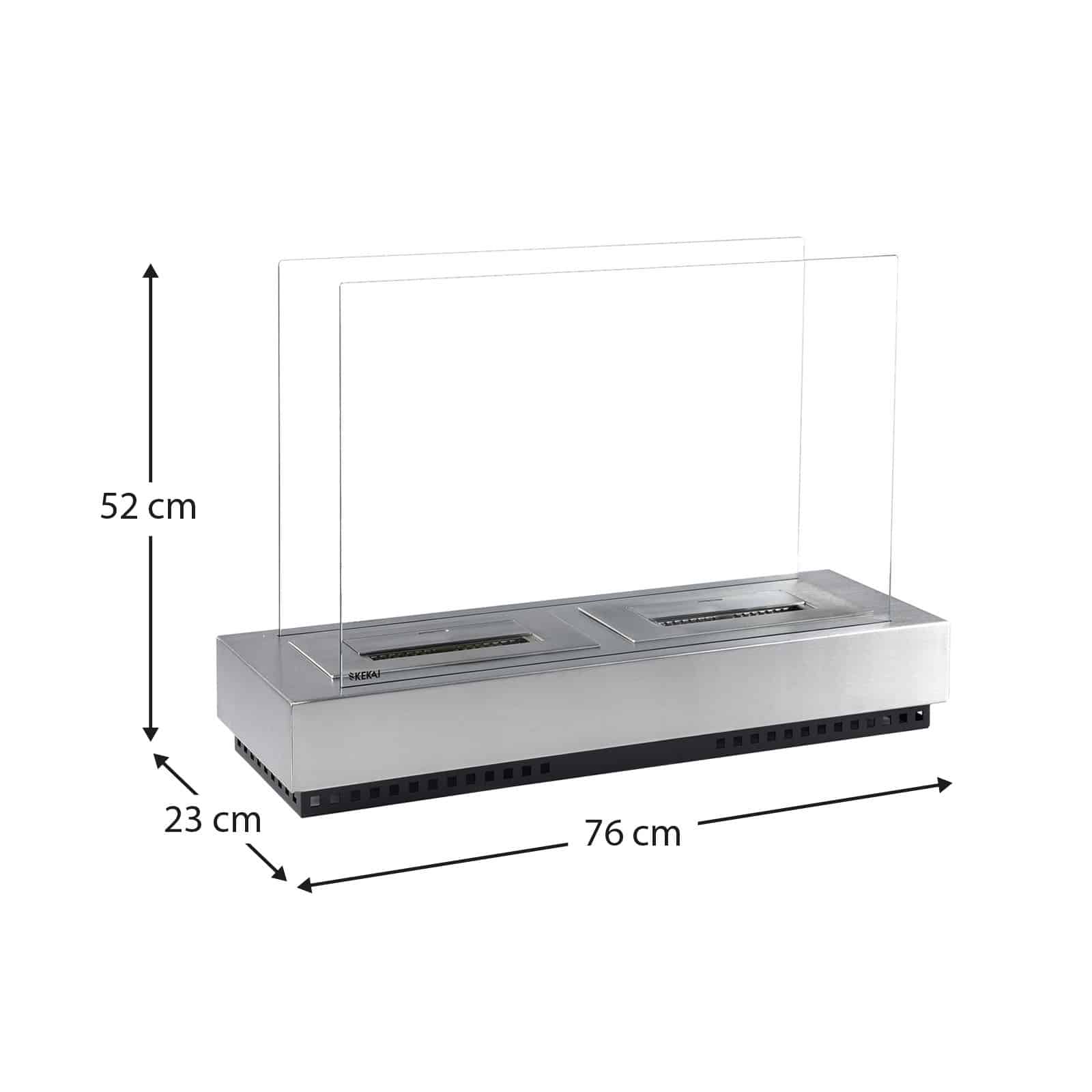 Lareira a bioetanol da KEKAI. Fabricada em aço e vidro temperado. Depósito: 3000 ml: 210 minutos de combustão. Inclui um extintor manual. Não necessita de instalação.