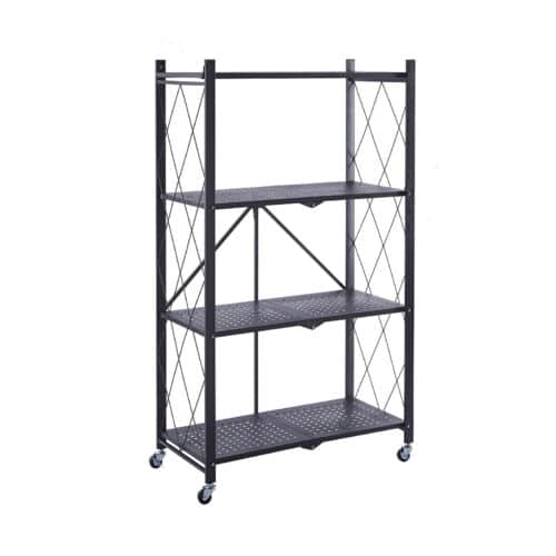 Estante modular Kim 122. Fabricada com uma estrutura de aço pintada de preto. 4 prateleiras metálicas, cada uma com capacidade para suportar até 40 kg. Grelhas laterais que impedem a queda de objetos e prateleiras perfuradas que evitam a acumulação de pó e facilitam a limpeza. Dispõe de 4 rodas, duas das quais com bloqueio inteligente e capacidade de rotação de 360º. Não necessita de instalação. Basta desdobrar e está pronta a usar. Certificado: CE.