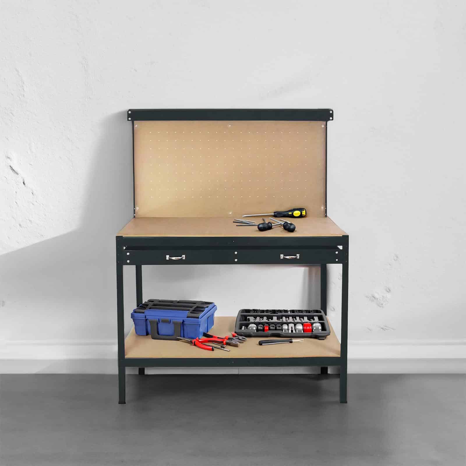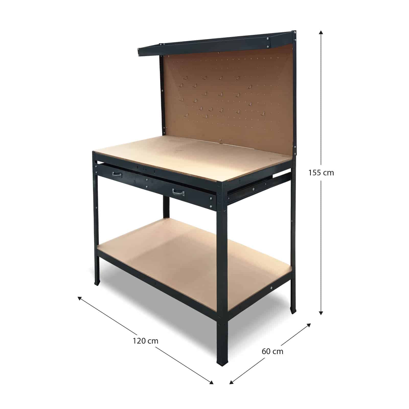 Mesa de trabalho da Catter House. Estrutura em aço galvanizado. Tampo em MDF. Peso suportado: 230 kg. Inclui um kit de ferramentas com 25 peças. Certificados CE e REACH, que garantem a qualidade do produto.