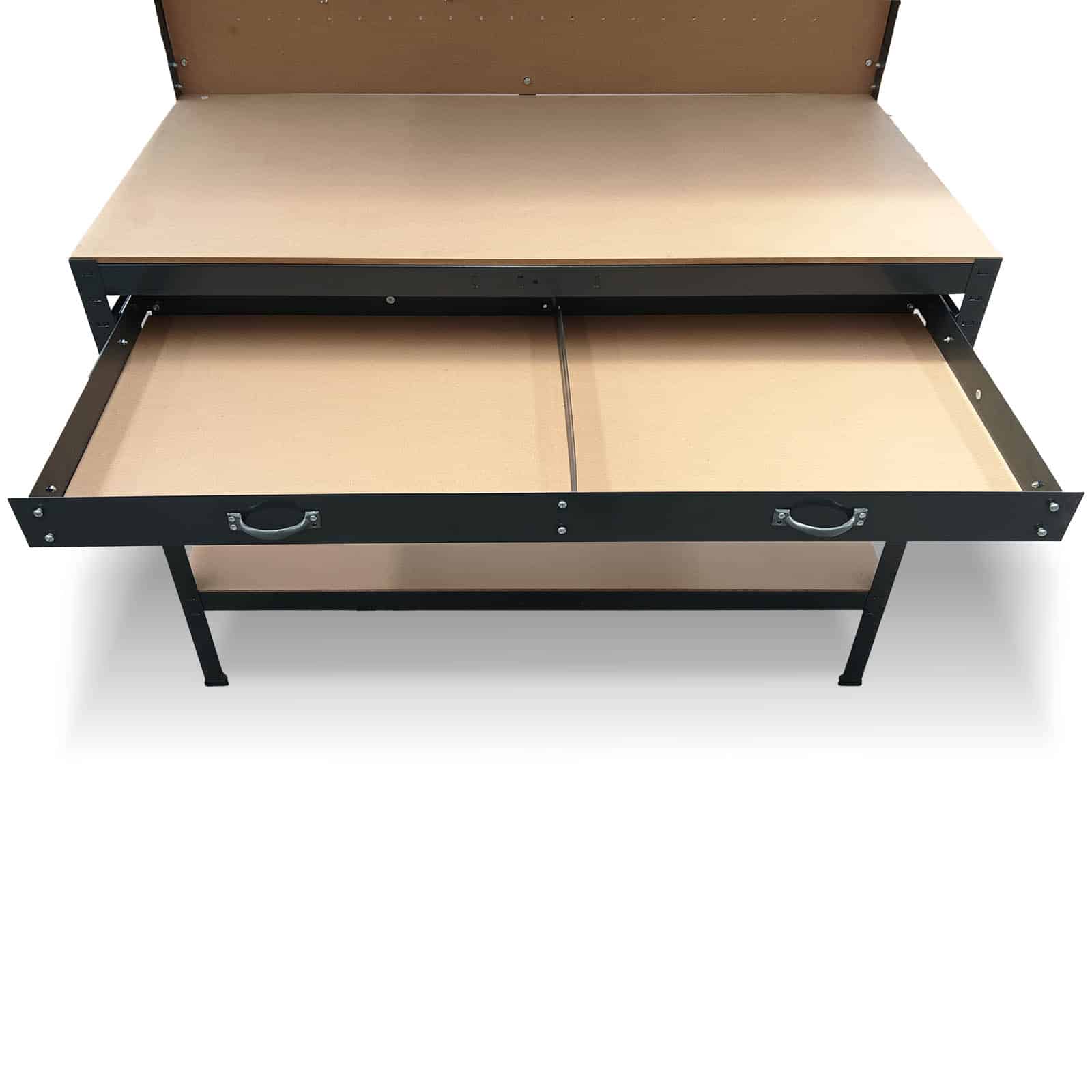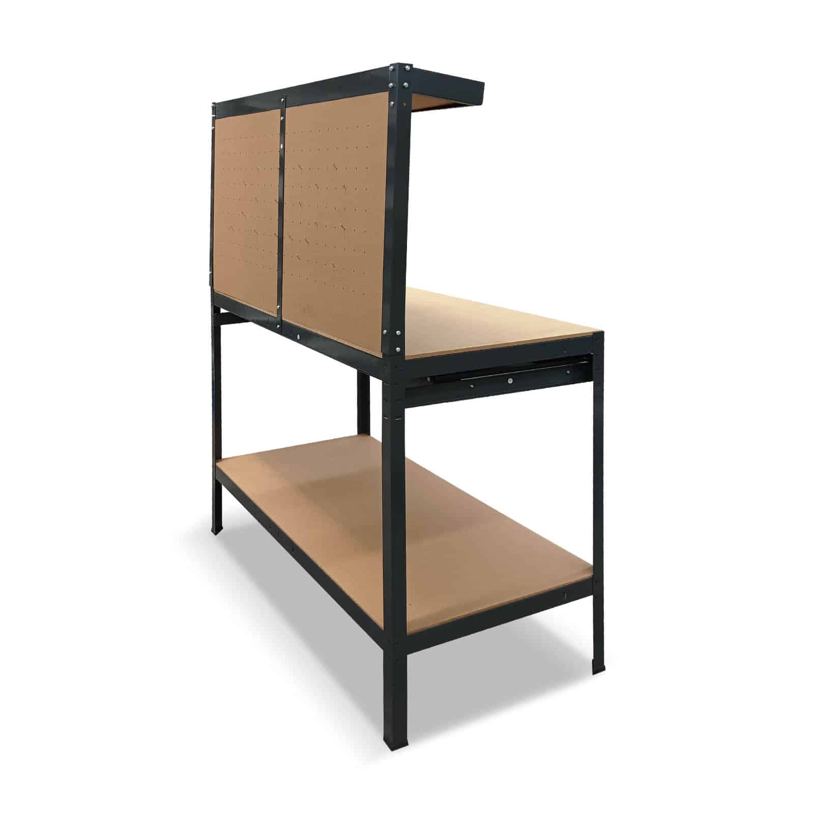 Mesa de trabalho Cargo Advance. Fabricadas com uma estrutura de aço galvanizado de 0,9 mm de espessura. Com um tampo em MDF com 3 mm de espessura que pode suportar até 230 kg de peso. Tem uma parede que inclui um kit de 25 peças para colocar as suas ferramentas: 15 ganchos curtos, 5 ganchos longos, 2 ganchos duplos e 3 suportes para ferramentas. A parede pode suportar um peso total até 20 kg. Prateleira inferior para arrumação. Possui certificação CE e REACH.