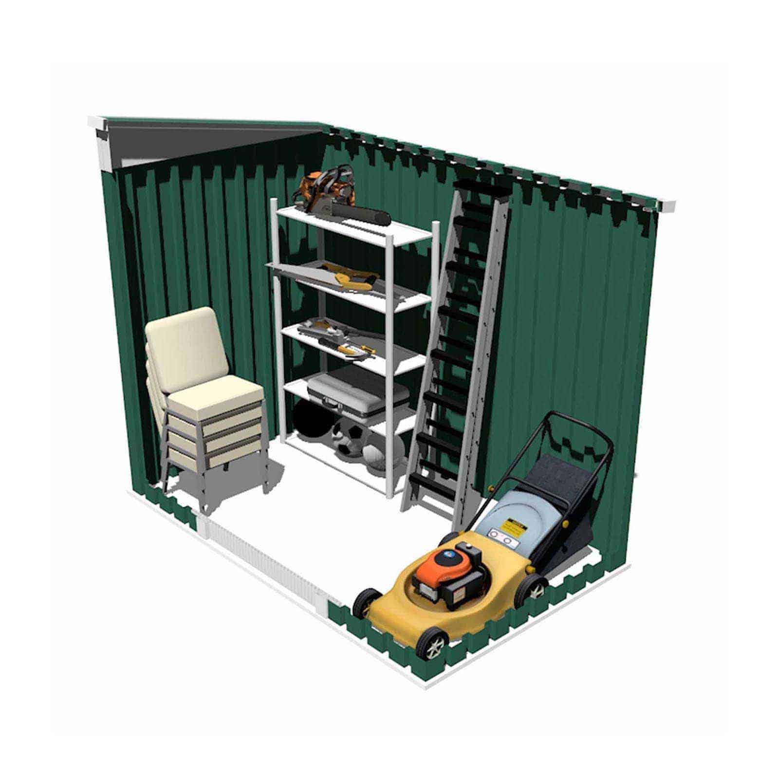 Abrigo de jardim Buckingham em aço galvanizado bicolor com 0,25 mm de espessura. Estrutura em aço zincado 0,5-0,8 mm. Com telhado de uma água. Porta dupla de correr com opção de cadeado (não incluído). Chão não incluído. Garantia anticorrosão de 10 anos.