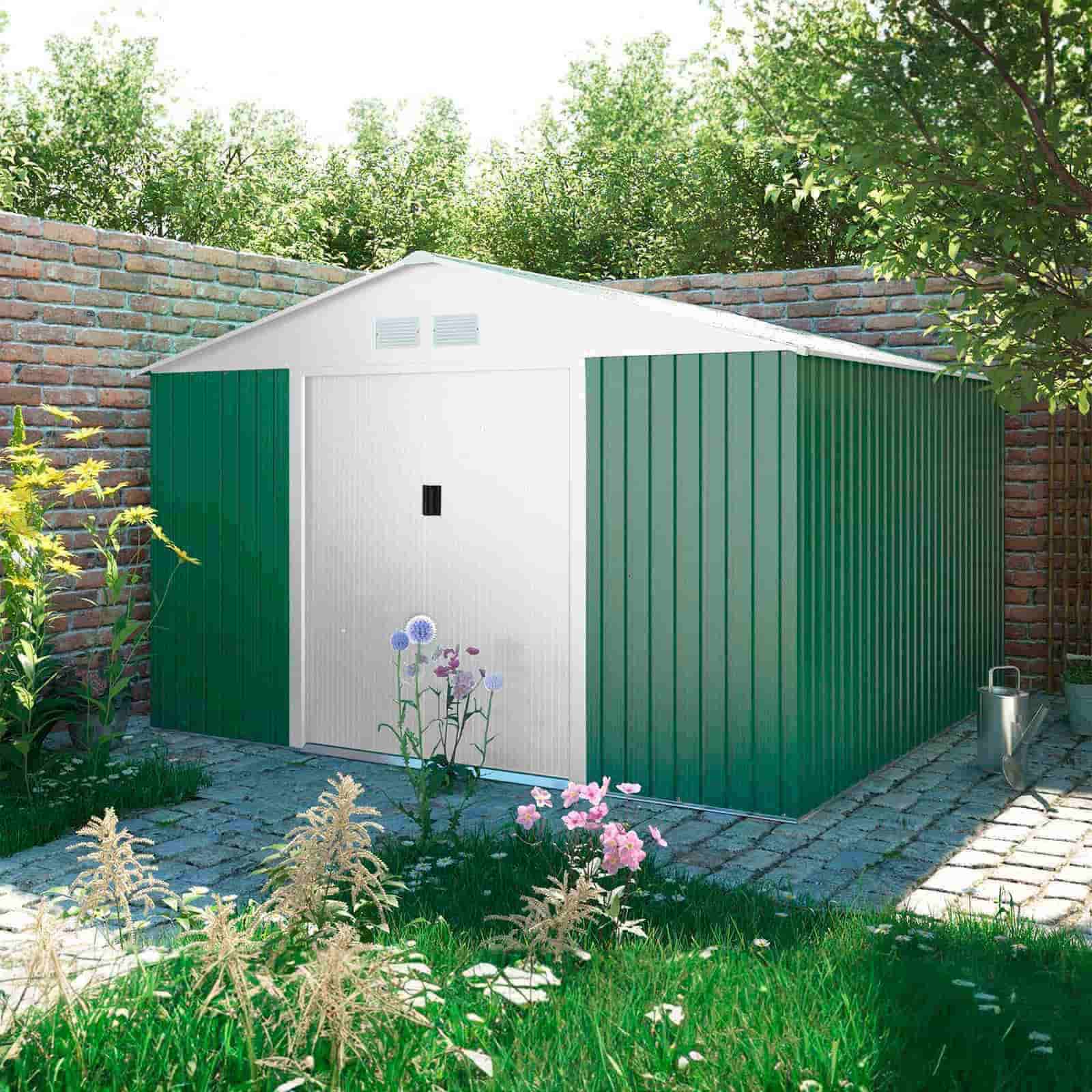 Abrigo de jardim em aço galvanizado, duas cores (verde e branco). Telhado de duas águas. Estrutura em aço zincado. Porta dupla de correr que permite a colocação de um cadeado (não incluído). Respiros. Chão não incluído. Garantia anticorrosão de 10 anos.