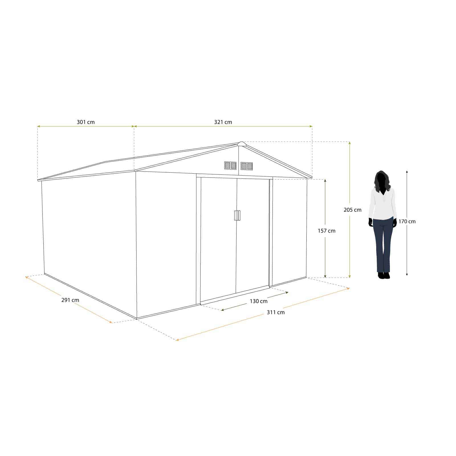 O abrigo de jardim Coventry é fabricado em chapa de aço galvanizado com paredes de 0,25 mm de espessura e uma estrutura de aço zincado para reforço. O seu telhado de duas águas é muito funcional, pois evita a acumulação de água. A sua porta dupla de correr é suficientemente larga para permitir a passagem de objetos de grandes dimensões. Para maior segurança, esta porta pode ser fechada com um cadeado (não incluído). Um dos pontos mais notáveis deste abrigo é o seu sistema de ventilação, através de respiros, que garante um ambiente fresco no interior. Chão não incluído.