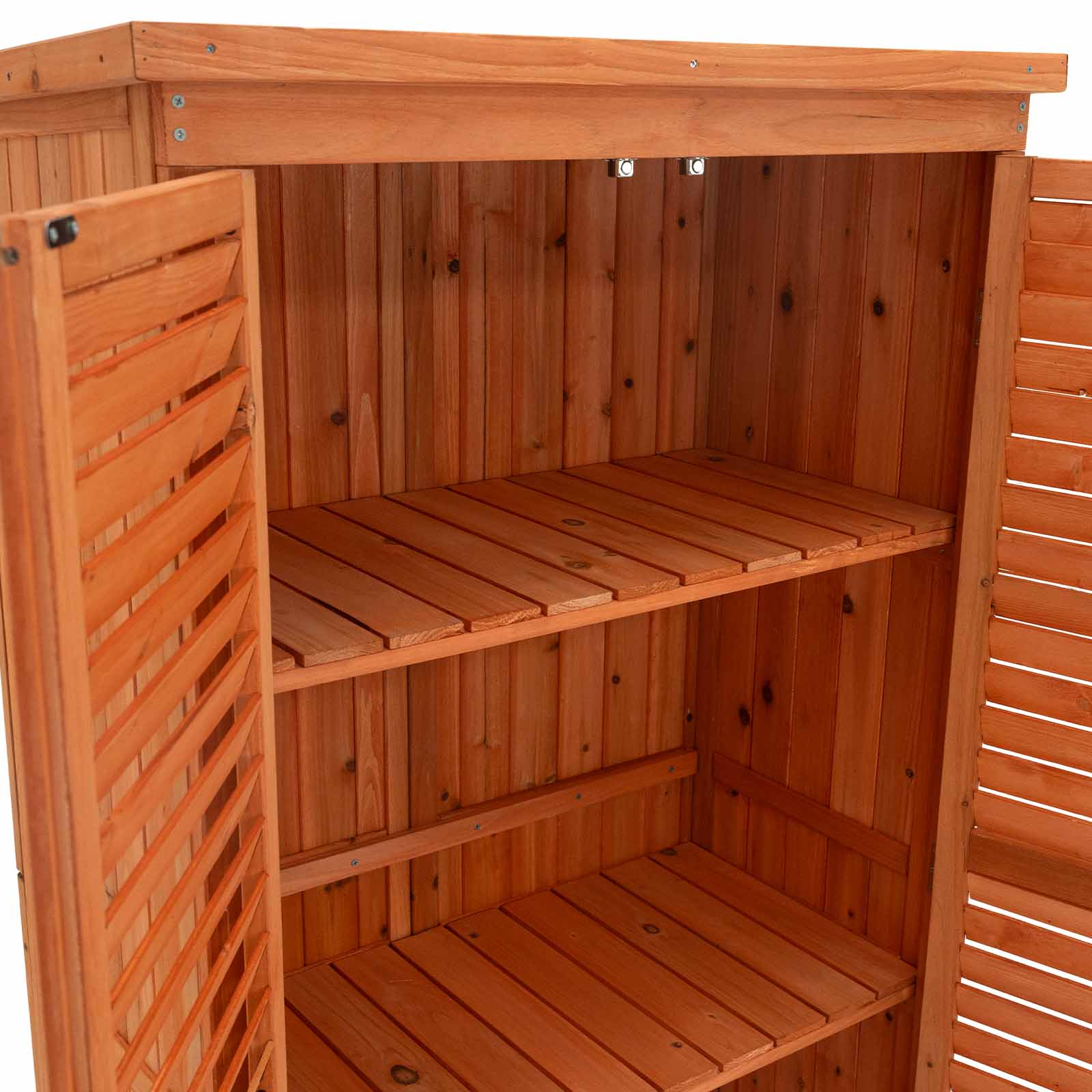 Este armário é feito de madeira de pinho. É robusto e resistente. Tem três espaços de arrumação espaçosos e de tamanhos diferentes. Tem uma porta de cortina com duas folhas que permite a livre circulação do ar, mantendo o interior fresco e arejado, o que é perfeito para guardar ferramentas e objetos que necessitem de ventilação. O seu telhado é coberto com tela asfáltica para o proteger da chuva e do sol, tornando-o ideal para utilização no exterior. Equipado com um fecho incorporado.