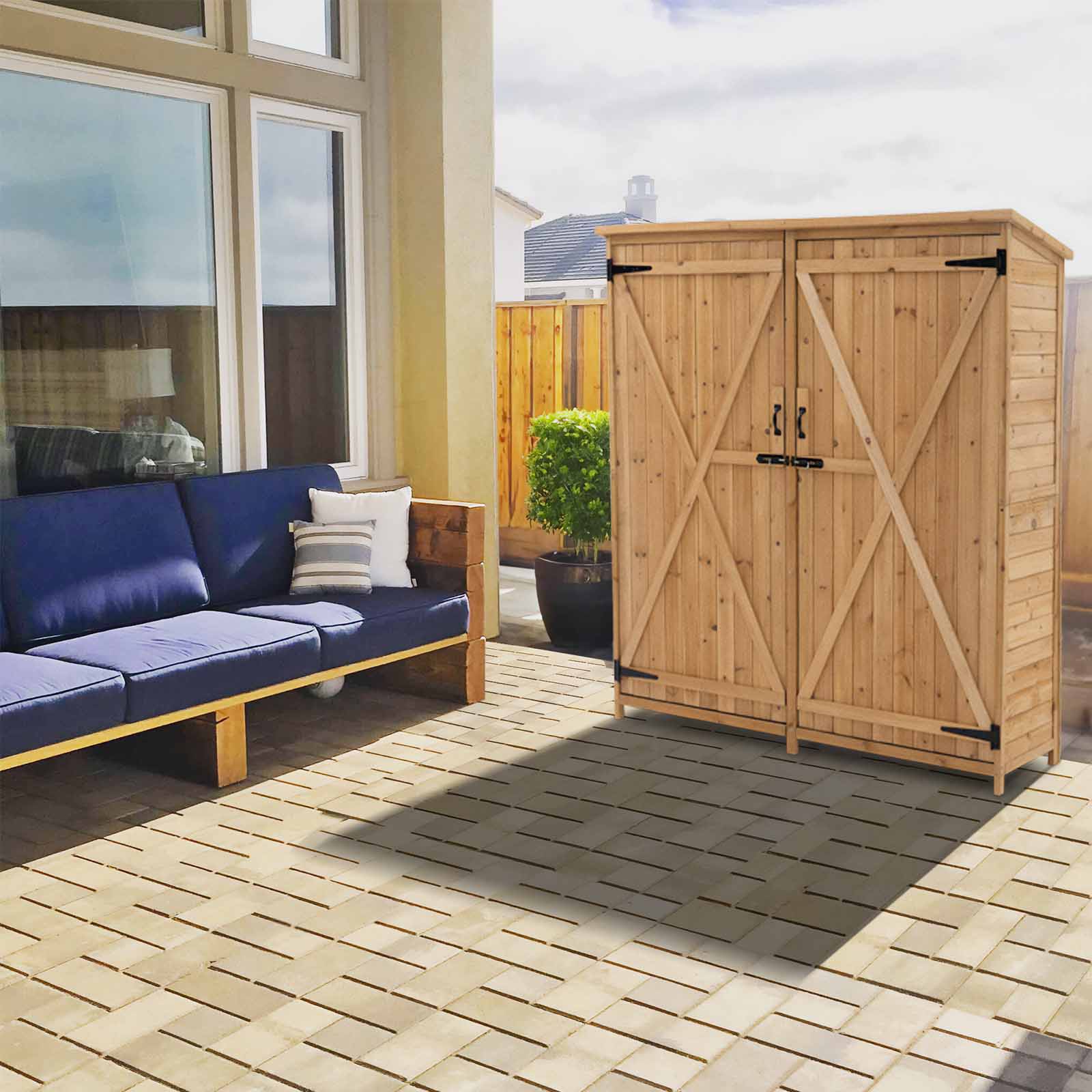 Sim. Este armário foi concebido com materiais resistentes à água, incluindo chapa asfáltica no teto. Isto garante que o seu armário se manterá como novo, mesmo em condições climatéricas adversas. No entanto, recomenda-se a aplicação de um verniz ou de um revestimento protetor para garantir a resistência à humidade e prolongar a sua vida útil.