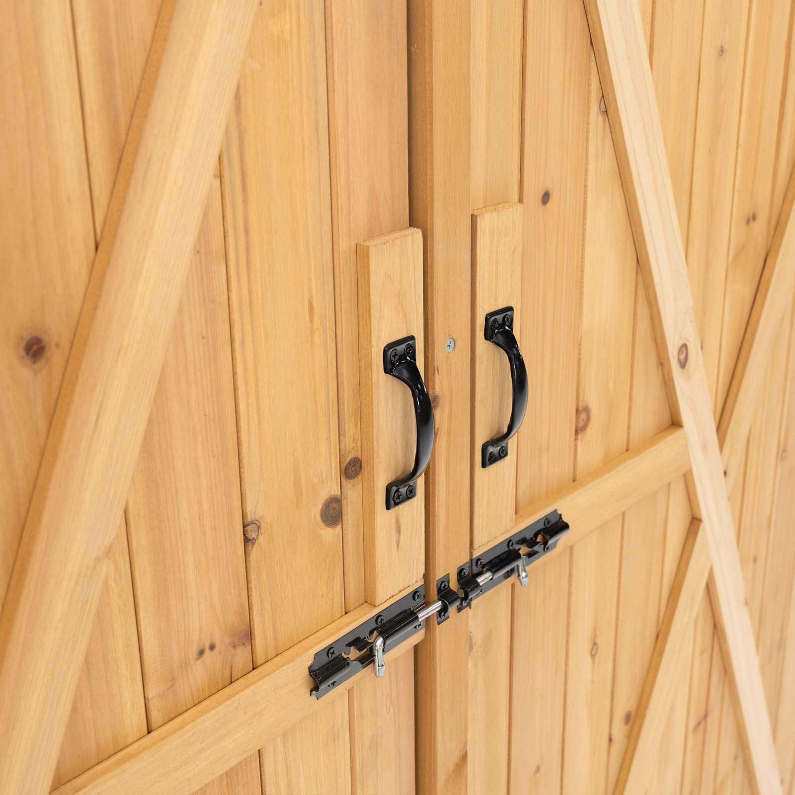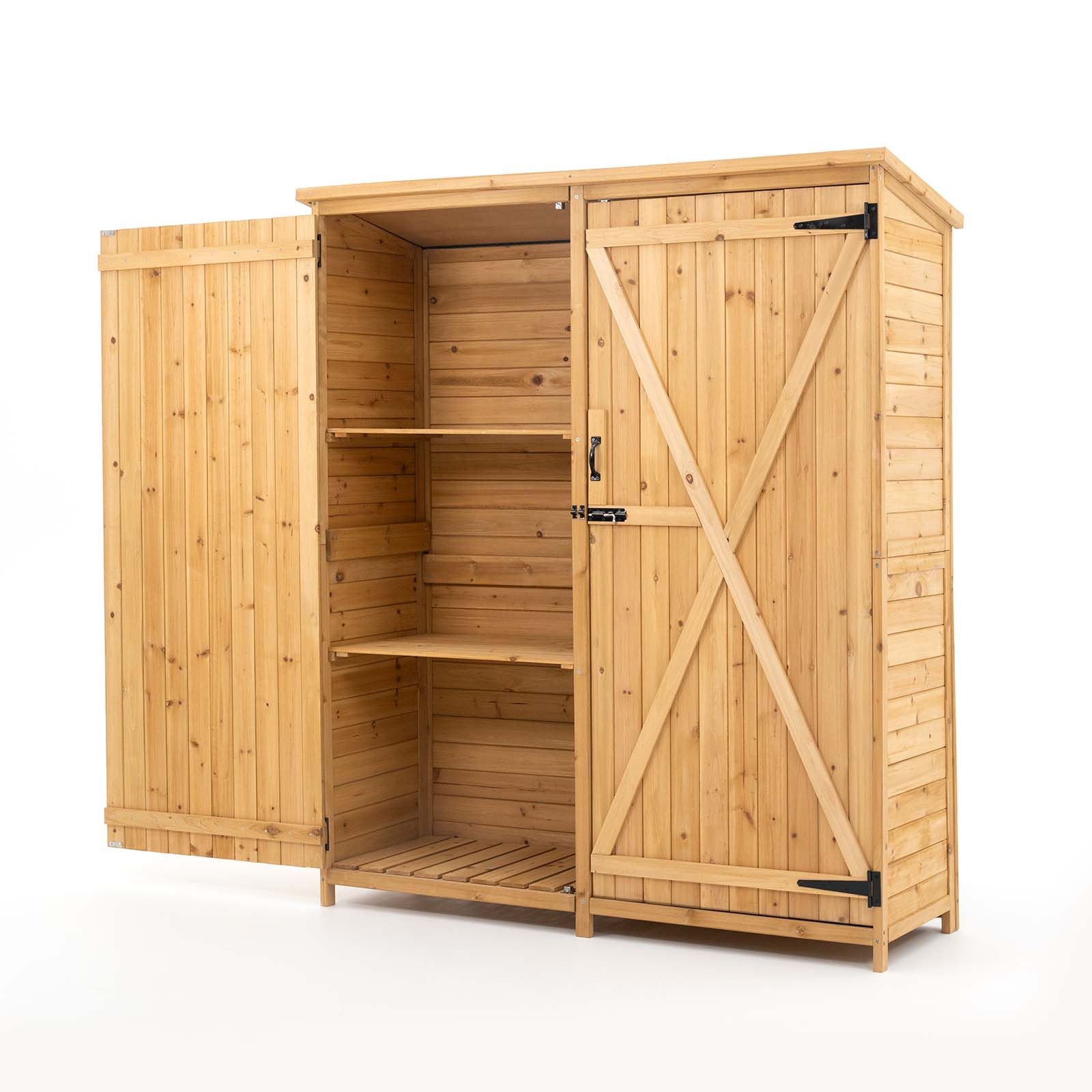 Armário de jardim em madeira de pinho com 10 mm de espessura. Concebido e fabricado com materiais impermeáveis e resistentes às intempéries, tal como o seu telhado com revestimento impermeável em chapa asfáltica. Com uma porta de duas folhas e uma zona de arrumação dupla no interior.