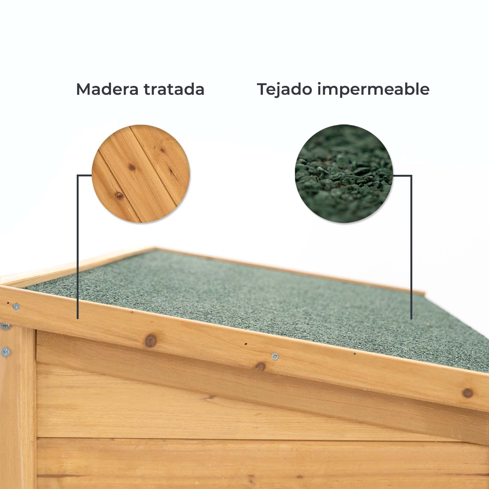 Este armário de jardim em madeira de pinho tratada com 2 camadas de tinta à base de água foi concebido para lhe oferecer um amplo espaço de arrumação com duas zonas distintas. Uma delas tem prateleiras para facilitar a arrumação dos seus objetos. Tem duas portas articuladas e o seu teto é impermeabilizado com uma chapa asfáltica repelente de água. O seu estilo rústico dará um toque acolhedor e caseiro ao espaço exterior onde o colocar.