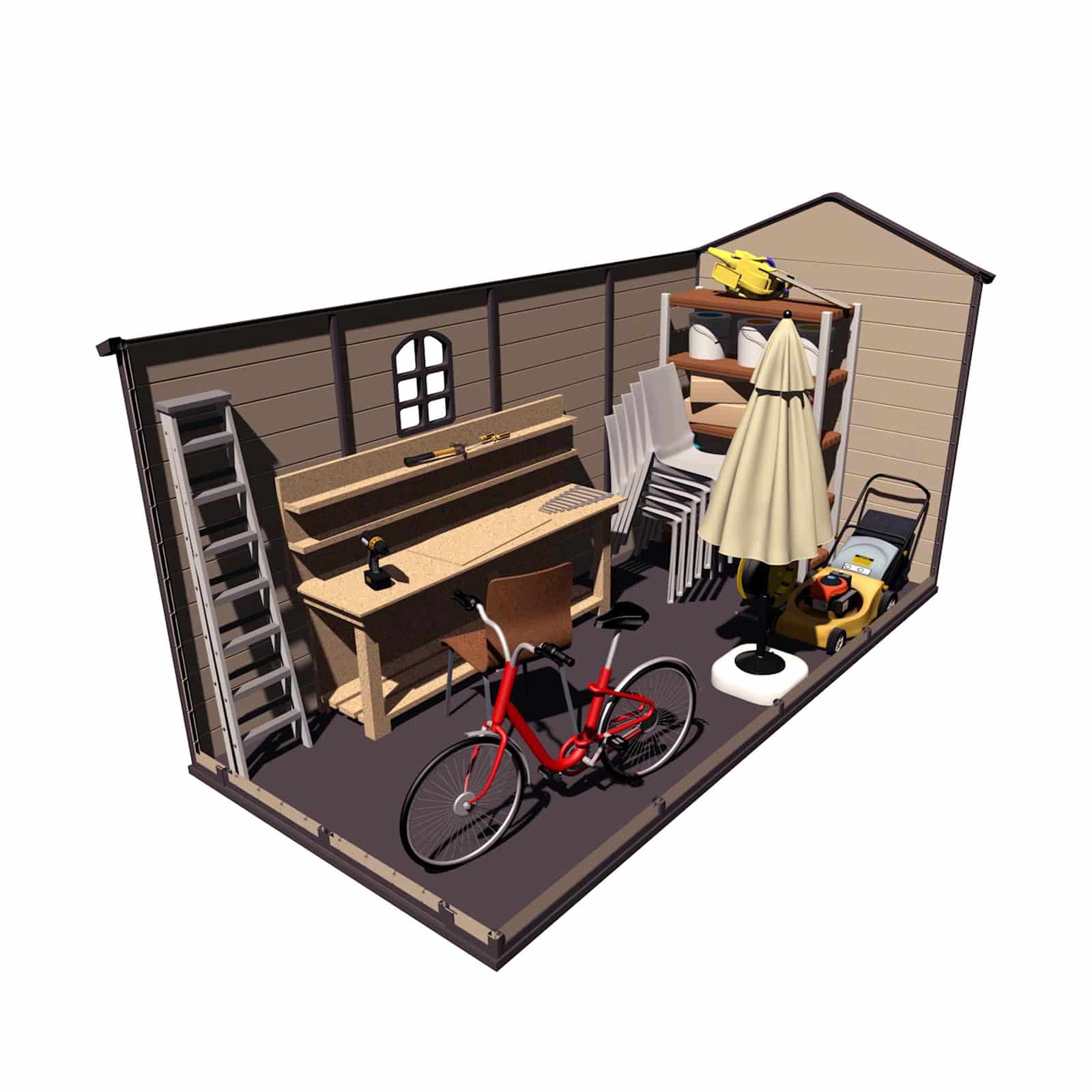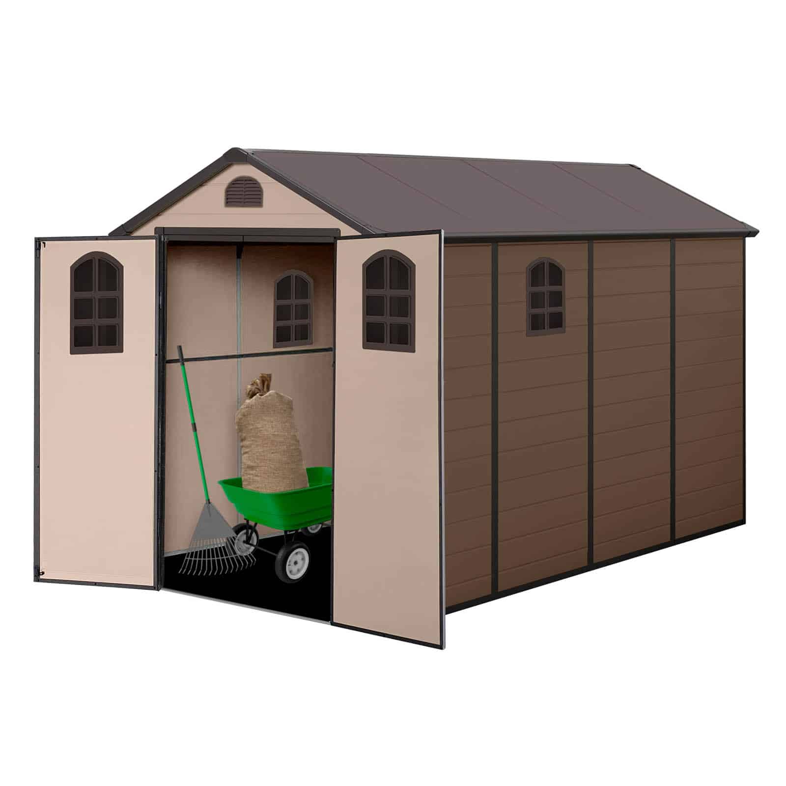 Abrigo em resina de polipropileno tubular (espessura da parede: 12 mm). A sua robustez é acentuada pelos reforços em alumínio que incorpora. O telhado de duas águas garante uma drenagem eficaz. Uma das suas características mais notáveis é a luminosidade interior, graças às janelas de policarbonato, tanto na parte dianteira como nas laterais. Possui uma porta dupla articulada com uma fechadura metálica que pode ser equipada com um cadeado (não incluído). O chão, para além de dar estabilidade à estrutura, protege o conteúdo da humidade e do contacto direto com o solo. E, para garantir um ambiente interior ótimo, foram integrados respiros.